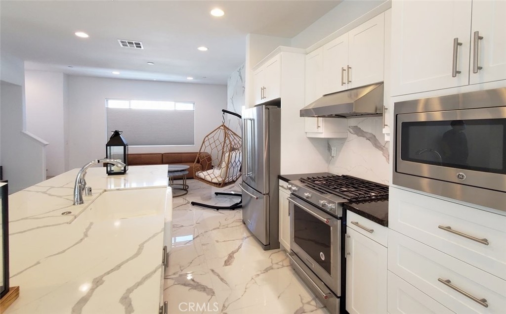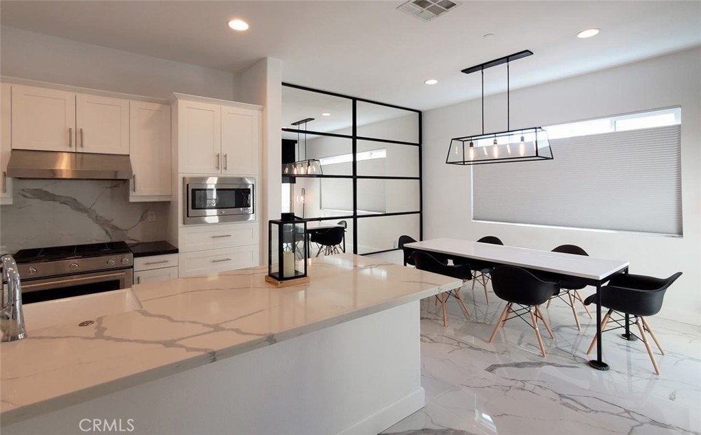 This luxury are detached condos with all three master bedrooms. Built in 2017, this home boasts a luxurious and paradise resort design throughout that can be seen on all 3 floors. The main level features high ceiling and Calacatta marble are throughout the floor. The kitchen is accentuated with designer finishes and is designed island kitchen with white quartz on the counter top and white cabinets & pantry cabinets room. The family room includes a cozy fireplace to enjoy home entertainment and warmth. Below on the first floor is bedroom with bathroom as a mother-in-law suite with all the amenities for the perfect space designed for long term stay or enjoyment for your family members. On the third level are two spacious master bedrooms with expert laminated flooring and features dual sinks, quartz vanity, and Calacatta marble floors for the bathrooms. Exclusive to this condo is that it does not share walls & corner lot with L-sharp private concrete yards for BBQ / Kids playing the ground. Ample common parking lot for guess and very low HOA $125 monthly. Location in West of Anaheim convenience to bus stop, shopping and schools including Walt Disney Elementary School and Oxford Academy. It is a MUST SEE!