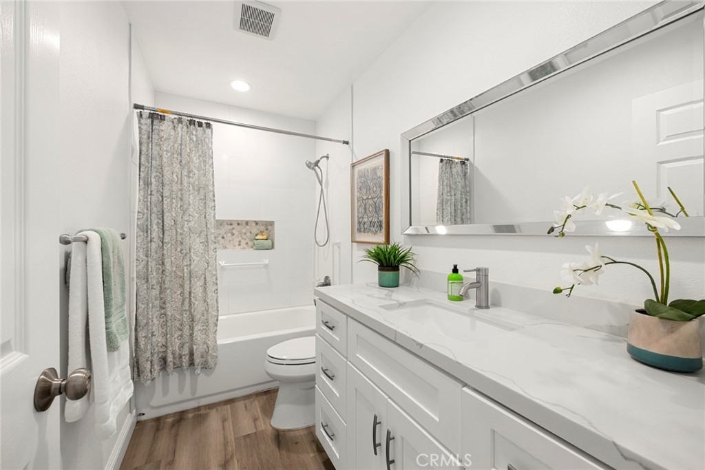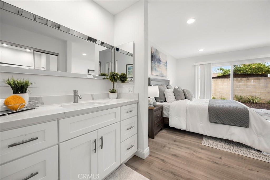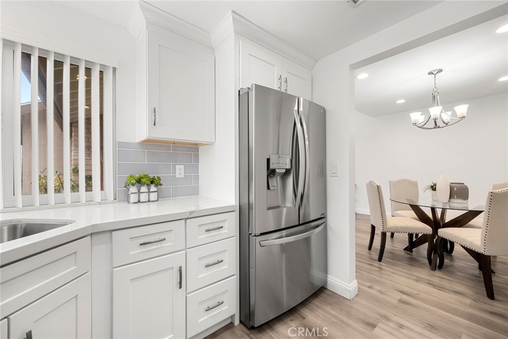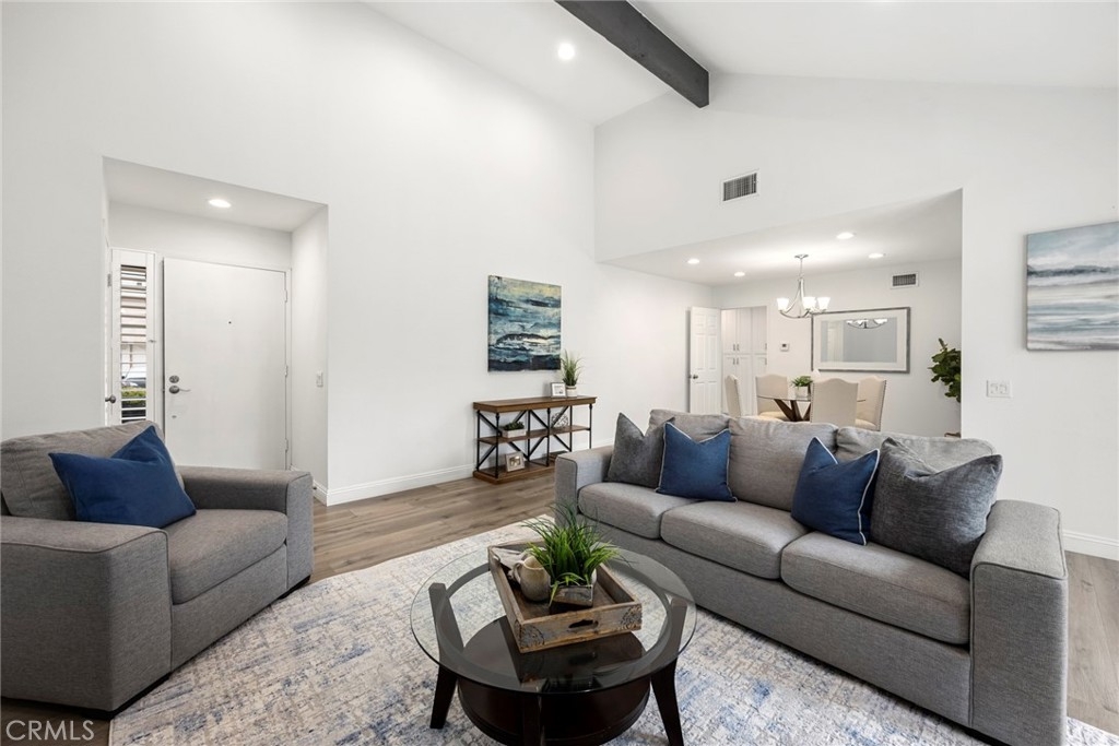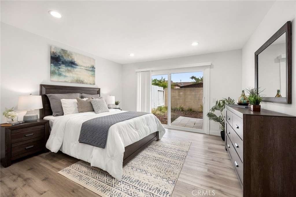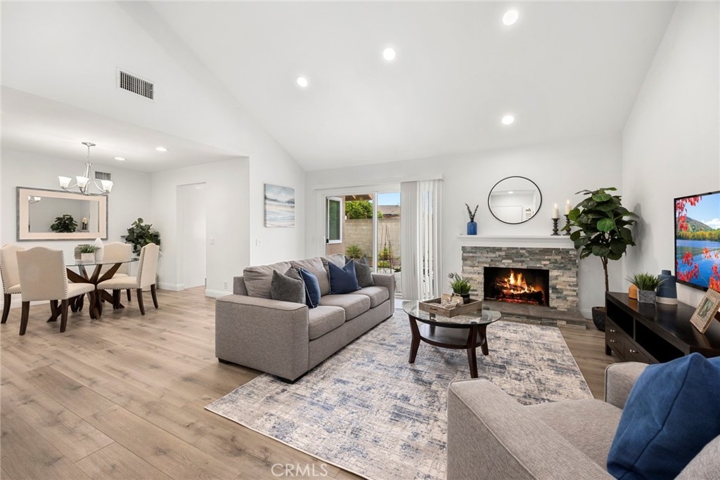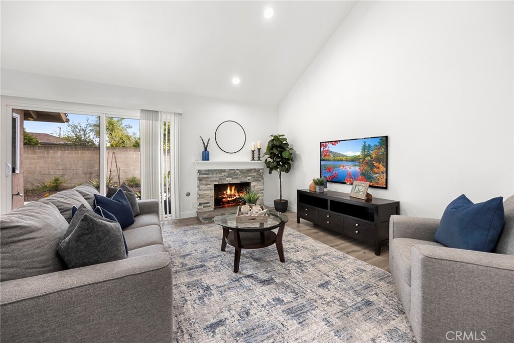 Welcome home to a move-in ready townhome with the epitome of timeless charm. Beautifully remodeled, this spacious 2BR/2BA townhome is filled with comfort, space and style. The open, airy living room with a cozy fireplace warmly invites you in. Enjoy vaulted ceilings, recessed lighting, and laminate flooring. The large kitchen boasts quartz countertops and stainless steel appliances. The oversized Primary suite offers direct access to the backyard, a large closet and ensuite bath. A lovely, fenced backyard with patio space plus a spacious two-car attached garage rounds out this home. Residents enjoy access to a community pool and spa. Conveniently located in Anaheim, 15 minutes from Disneyland and commuting is a breeze as you are close to both 91 and 5 freeways as well as local shops and restaurants.