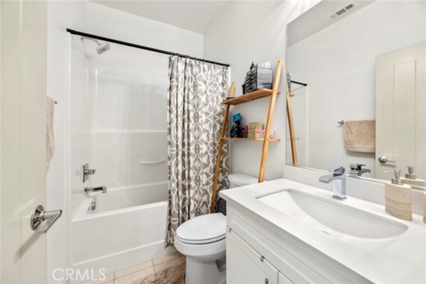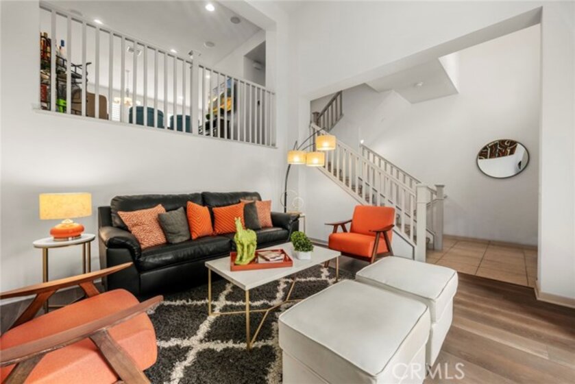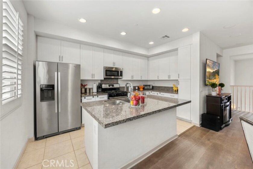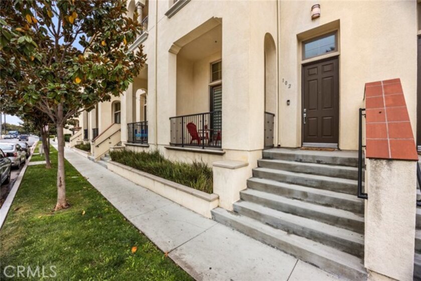 Come home to Downtown Anaheim and the Circa townhomes, enjoying an enviable location a short stroll from all that Downtown Anaheim has to offer including the Packing House, multiple eateries, coffee shops and boutiques. This beautiful residence was built in 2015 and offers a light and bright interior with ample windows and soaring ceilings. Step inside to an impressive formal living room with luxury plank wood flooring and French doors with custom window coverings that lead to a charming patio/terrace. The main living area is open concept and consists of a family room area and a comfortably sized dining area with chandelier. Custom plantations are on all the south facing windows. The impressively sized kitchen hosts amazing counter space and beautiful white shaker cabinetry as well as SS appliances. The kitchen island has a breakfast counter too! Surround sound speakers are throughout the main level. Upstairs you will find an inviting and comfortably sized primary suite complete with French doors to another terrace, a walk in closet and en-suite bathroom with dual sink vanity and walk-in shower. Two secondary bedrooms are found at the rear of the home with an adjacent full bathroom that is perfectly appointed. Convenient upstairs laundry connections are in a hall closet. This smart home is complete with Ring Door Bell, Wyze smart front door lock and Ecobee thermostat with Alexia integrated plus a 240V outlet in the garage for your EV! Don’t wait on this move in ready opportunity in this small enclave community in the center of it all!