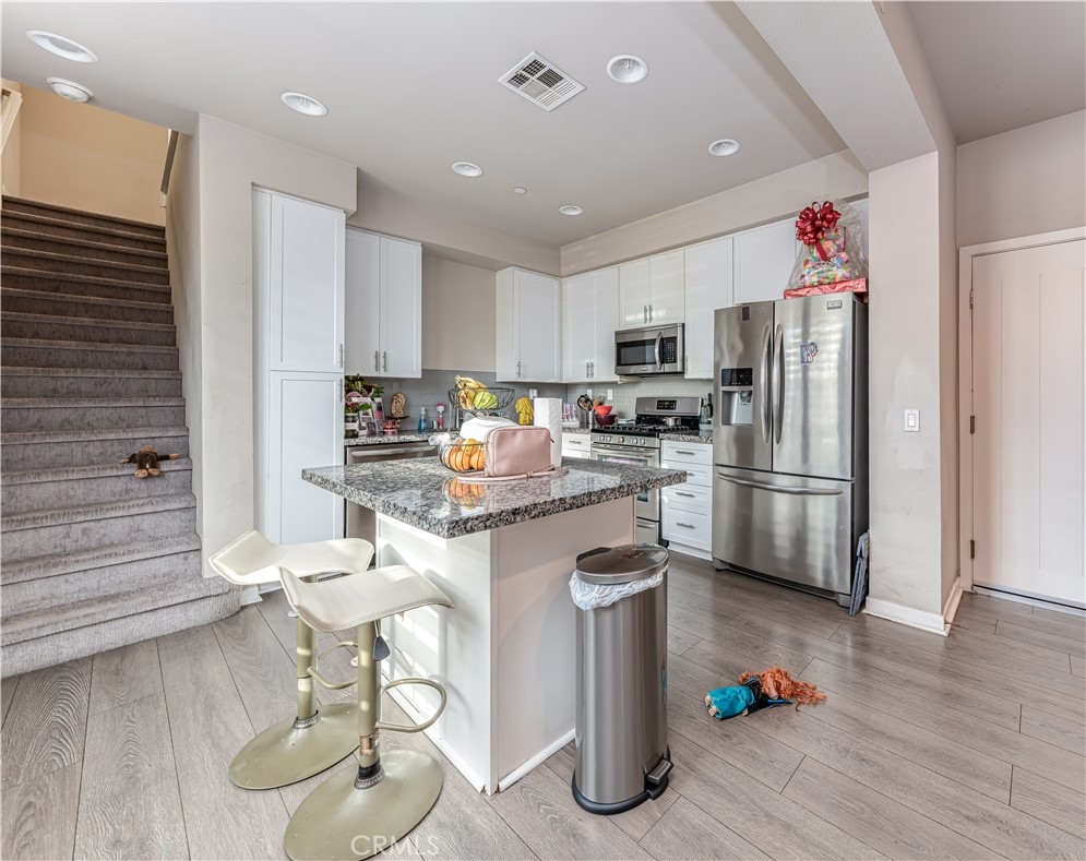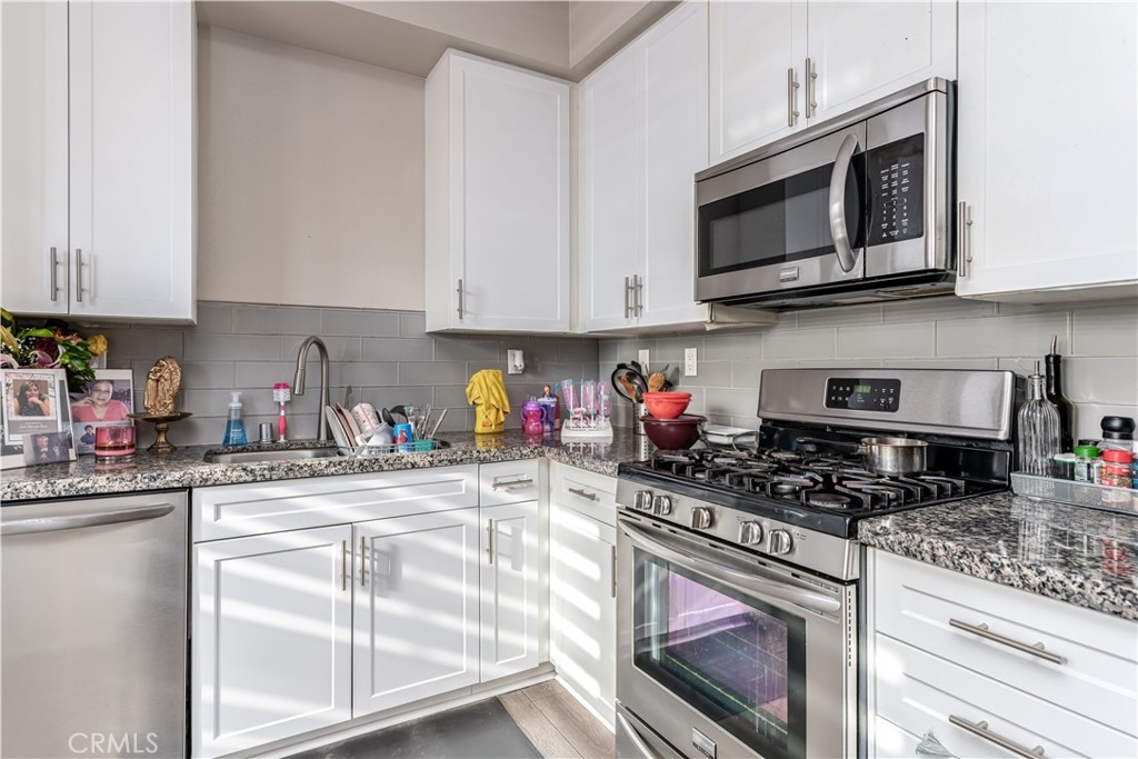 Craftsman Style 3 bedroom, 2.5 bathroom end-unit condo located near the heart of Downtown Anaheim's Packing District and Center City eateries, bars, and shops. Upon approaching the home you are met with a cozy front porch. Step inside to an open living room featuring natural lighting, a half bath, and direct access to the 2 car garage. Recessed lighting and laminate flooring can be seen throughout the home. Adjoined are the dining area and kitchen complete with a large island and breakfast bar. Granite counters, white shaker-style cabinets, and tile backsplash are showcased in the kitchen. Appliances include a 5 burner gas range, convection oven, dishwasher, microwave, and refrigerator. The second level offers an ample spaced loft area, laundry closet, the master suite, and 2 guest rooms. Decently sized, the loft area is perfect for a work-from-home office space. Between the guest rooms is a jack and jill bathroom with dual vanity and shower-in-tub. A large walk-in closet, soaking tub, walk-in shower, and dual vanity is boasted in the oversized master suite. Other features of the home include central a/c, double pane windows, and washer/gas dryer included. In close proximity to shopping, Disneyland, Downtown Disney, and the 5 FWY!