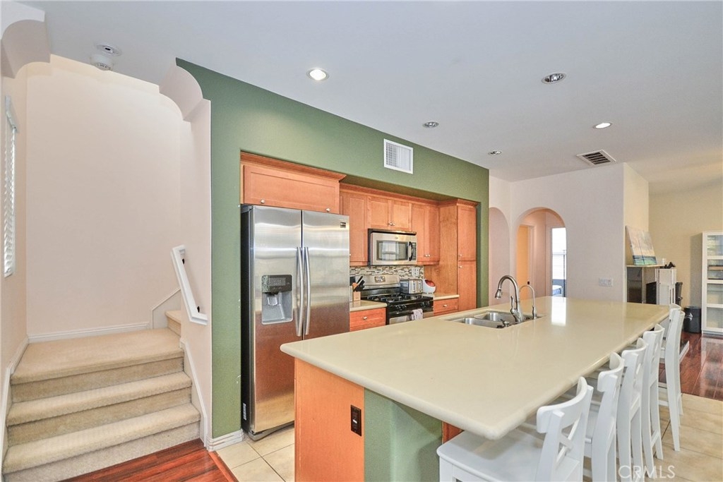 Welcome to this beautiful home in the heart of Anaheim that is ready for the perfect family to love. This wonderfully well-maintained private end-unit is located in the prestigious Legacy community at Colony Park, moments away from the Anaheim Packing Distract! This tri-level condo boasts an open floor plan with a seamless transition from the kitchen to the living room. Features include a stainless steel sink, massive kitchen countertop seating up to 6 guests, expansive flooring throughout the throughout the second floor, barstool countertop space, stone countertops, stainless steel gas stove top, and recessed lighting in the kitchen and dining. Private balcony access from the kitchen and enclosed first level porch. Step into the private master suite leading to the pristine master bathroom with a soaking tub, separate shower, and dual vanity. 1 bedroom with full bath on the 1st floor with its own door. Private full bathroom in every bedroom! Amenities include three pools, park, two roomy clubhouses, children's playground, a gym, and barbecue area. Attached two car garage. Priced to sell; come see this house today!