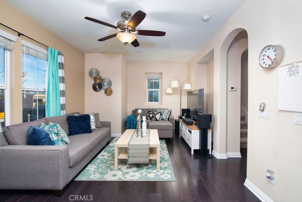 From the moment you arrive, you will absolutely love this elegant end unit in the Anaheim Colony Historic District! With dual master suites on the top floor and lots of living space on the middle floor, you'll have plenty of privacy as well as family togetherness. A spacious kitchen with striking dark granite countertops and white cabinetry offers a dining area and a door to a private balcony patio. New, upgraded carpeting, bedroom ceiling fans, and tankless water heater are just some of the touches lovingly added to the home. The resort-style amenities offered by the community include three saltwater pools and spas, barbecue areas, a gym facility, three clubhouses, a central park with water course, a playground, and a dog park. The HOA provides fire sprinklers and landscape maintenance. Parking is never an issue with the attached, two-car garage with storage space and a new garage door motor. Ideal location close to the 57, 5, and 91 freeways, dining and shopping, Anaheim Packing District, Angel Stadium, and of course, the magic of Disneyland. Hurry! Homes in this excellent area do not last!