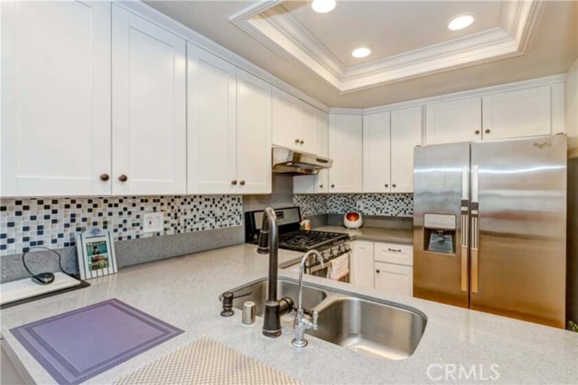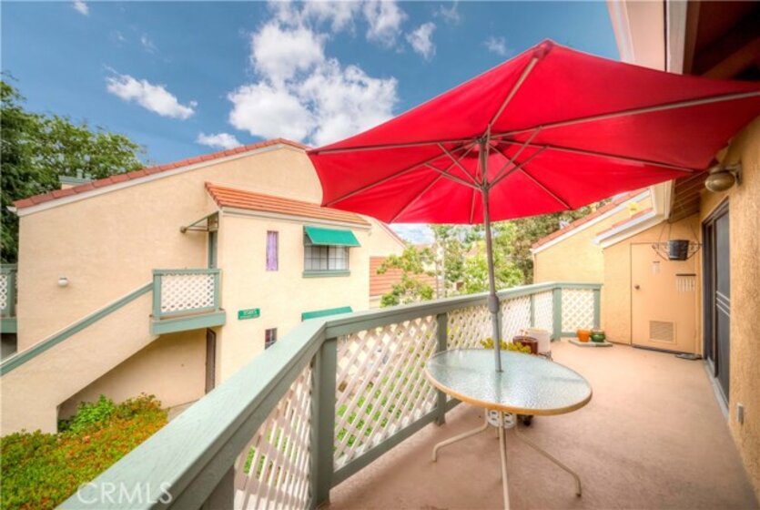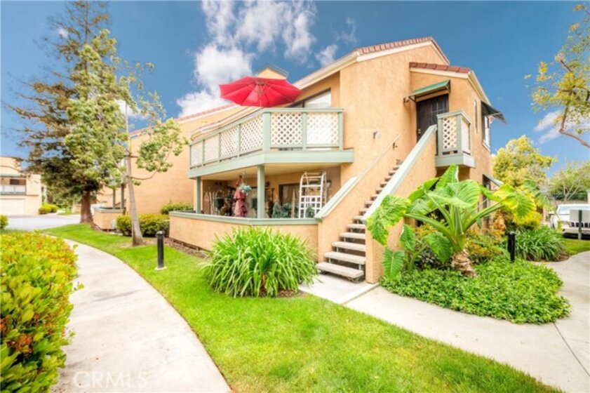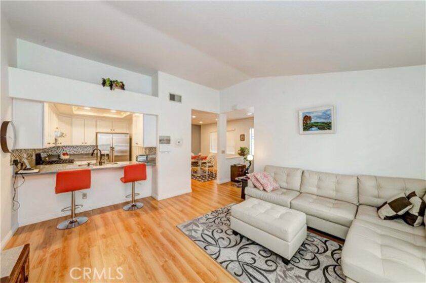 Welcome to most desirable condo complex 'Evergreen Village' in Anaheim. This one bedroom and one bath upper level end-unit features open floor plan with lots of natural lights. Unit has been upgraded with lighter color bamboo laminated flooring throughout the unit. Modern white kitchen cabinet with grey quartz countertop which also can be used as breakfast counter/bar overlooking the living room. Sliding doors on both living room and bedroom leads to the balcony with plantation shutters. Vaulted ceiling bedroom also has walk-in closet with custom built-ins. There is also inside side -by-side laundry. This unit comes with one car garage and one assigned covered carport. Central A/C with Forced air Heating. HOA features and covers for pools, spas, indoor sauna, greenbelt area, basic cable, internet, water & trash. Conveniently located close to parks, schools and shoppings.