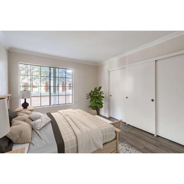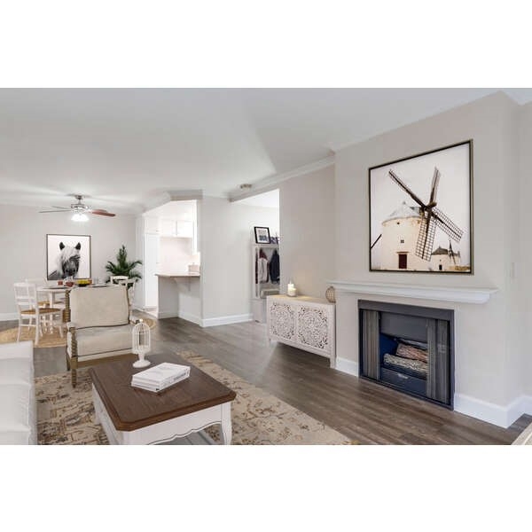 RARELY AVAILABLE! THIS STUNNING END UNIT REMODELED GROUND FLOOR CONDO HAS 2 GARAGES!!! Upon entering the home you'll find new vinyl plank flooring throughout, recessed lighting, upgraded kitchen with stainless steel appliances and granite countertops, custom paint, crown moldings and upgraded baseboard moldings. The wonderful home has 2 bedrooms and 2 full bathrooms, new 6 panel doors throughout, a remodeled bathroom with new vanity including a quartz countertop, re-glazed bathtubs and new fixtures and hardware. The spacious living room features a cozy fireplace and the large primary bedroom has an attached bathroom with a walk in closet. Additional features include indoor washer/dryer hookups and central heat and air conditioning. There are two separate patios...one of which is an expansive patio overlooking the lovely greenbelt area. Both of the garages have upgraded garage doors and the location of the home in the interior of the community is peaceful and the grounds feature an abundance of trees and flowers. The HOA dues include internet, cable, water and even trash! There is a sauna and even an enclosed area for your dogs. With 2 sparkling pools and spas there just isn't much more you could ask for...welcome home!!!
