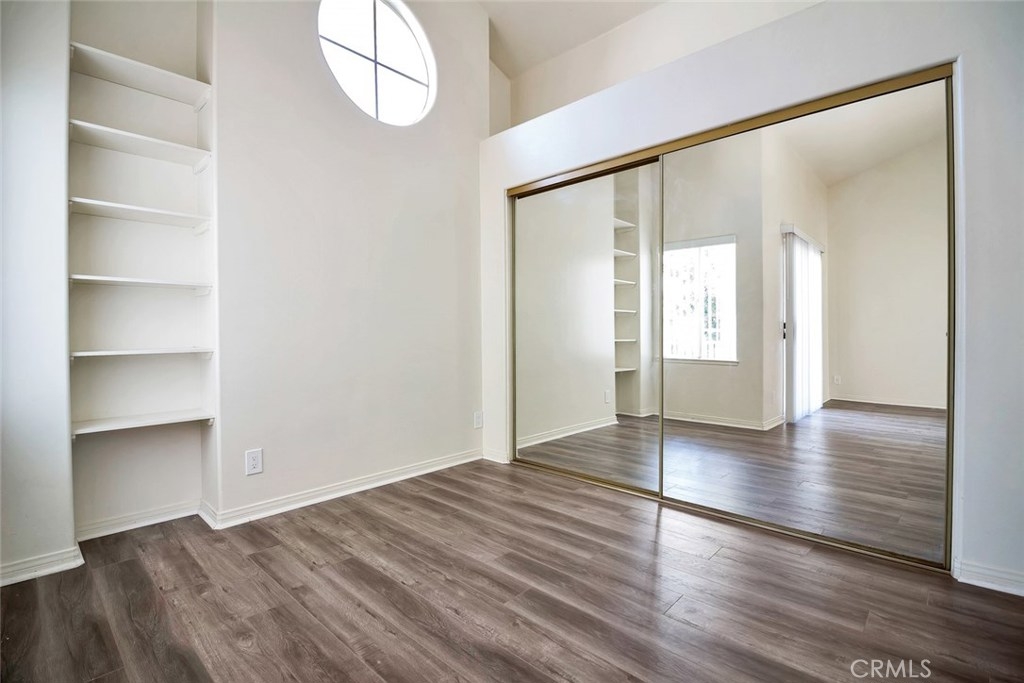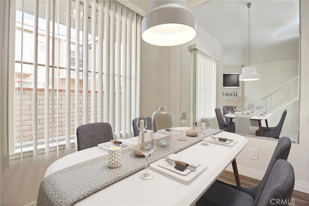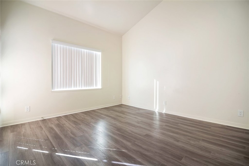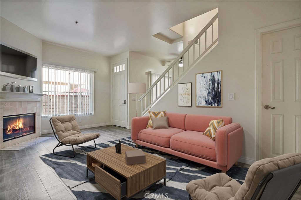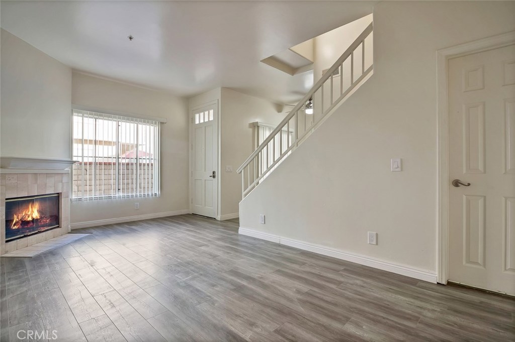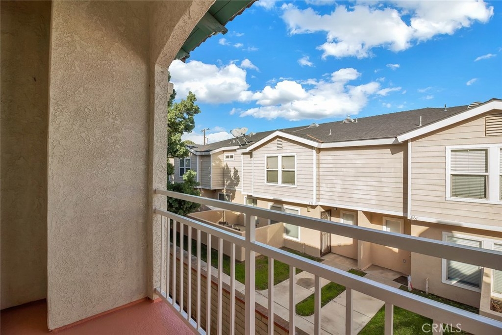 This light and bright two-level townhome is located in a gated community with community pool, spa and barbecues. Lots of windows for natural light, fresh interior paint, and newer distressed laminate wood flooring on both levels. Enter on the first level into the living room which offers an elegant fireplace and dining area with ceiling fan and window. The kitchen is off the dining area and has refinished cabinetry, a built-in microwave and brand new dishwasher and garbage disposal and newer stove. Master bedroom with built-in bookshelves, high ceilings, mirrored wardrobes and a sliding glass door that opens to private balcony. The master bathroom has a dual sink vanity. The two-car garage can be accessed directly from the interior and has laundry hook-ups.