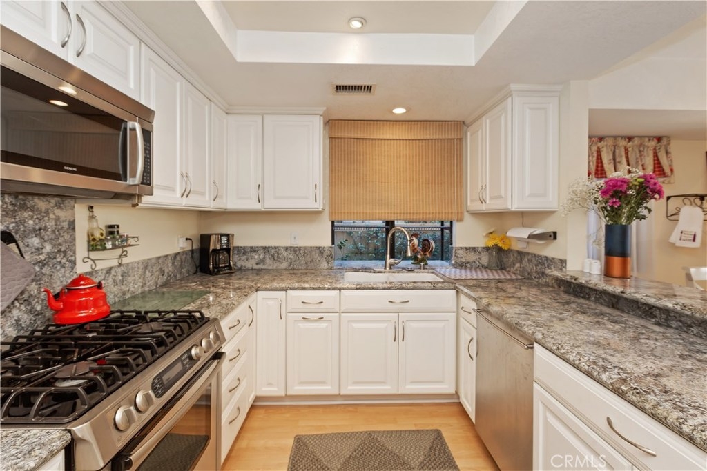Welcome home to this move in ready two story Condo! Located in the quiet and beautiful Laurelwood Village community of Anaheim. Close to freeways, shopping, schools, Honda Center, and Anaheim Stadium. The kitchen has been remodeled with white cabinets, granite countertops, and stainless steel appliances. The open floor plan on the first floor gives plenty of natural light and includes powder room, dinning room, living room, and leads out to the private patio. The openness of this home makes it a perfect place to entertain friends and family. Upstairs you have a spacious master bedroom with mirrored closet doors and a private bathroom. There's also plenty of space in the two other bedrooms upstairs. Additionally, the home includes two car garage and a large community pool. A must see home!