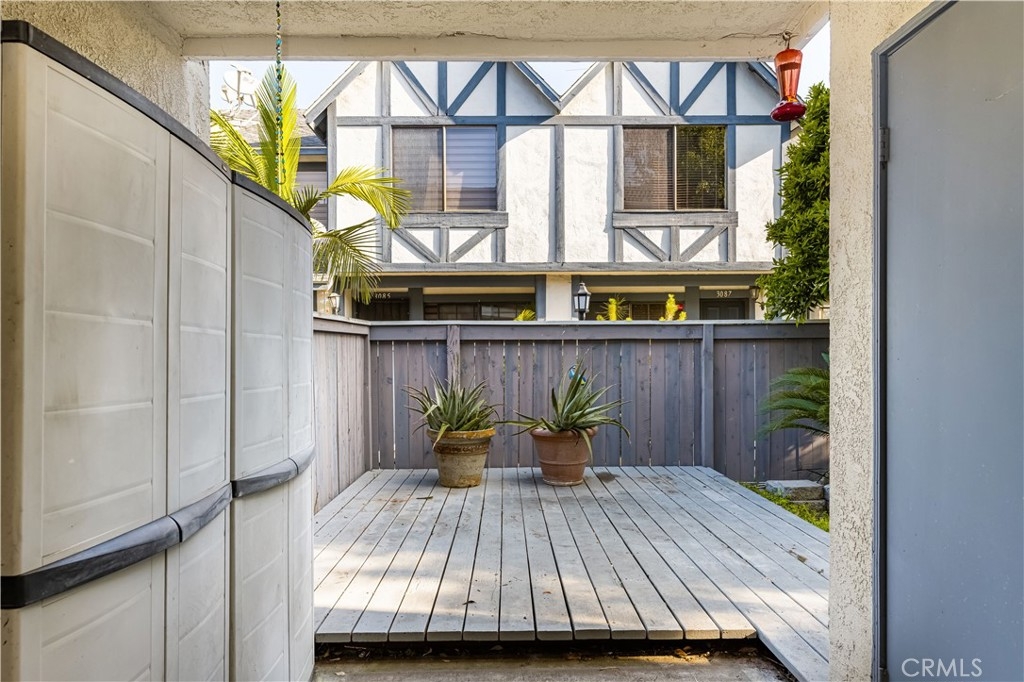 2 Bedroom, 2 Bath ground floor unit with large patio. 2 car garage with built in cabinetry close to unit, but not attached. 1 primary ensuite bedroom and 2nd bedroom can be considered a primary bedroom if the hall door is closed. Living room with gas fireplace, dining area and kitchen. Washer and dryer are in enclosure on the covered patio, plastic storage containers also on covered patio. Patio has wood deck area and tangerine tree and planters. Unit F is on the left side of the fenced area, straight up the walkway.