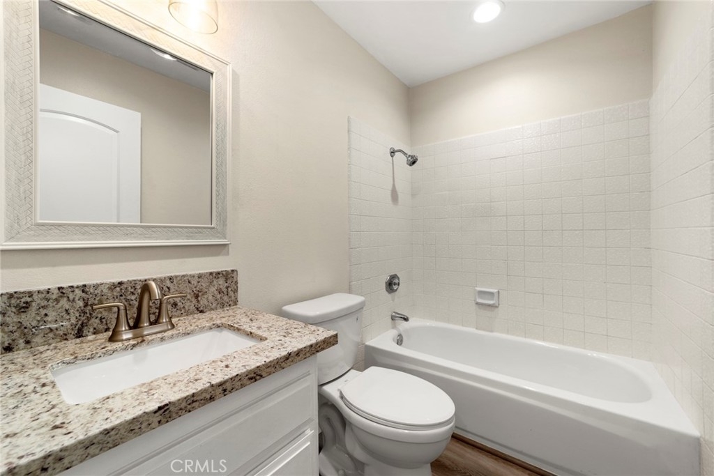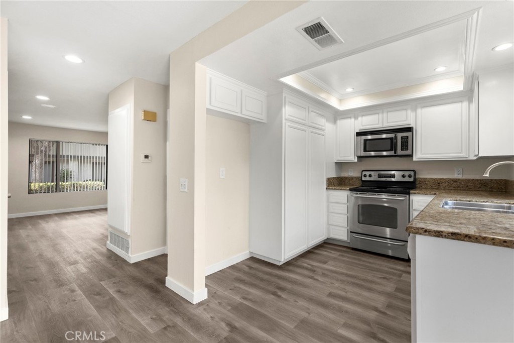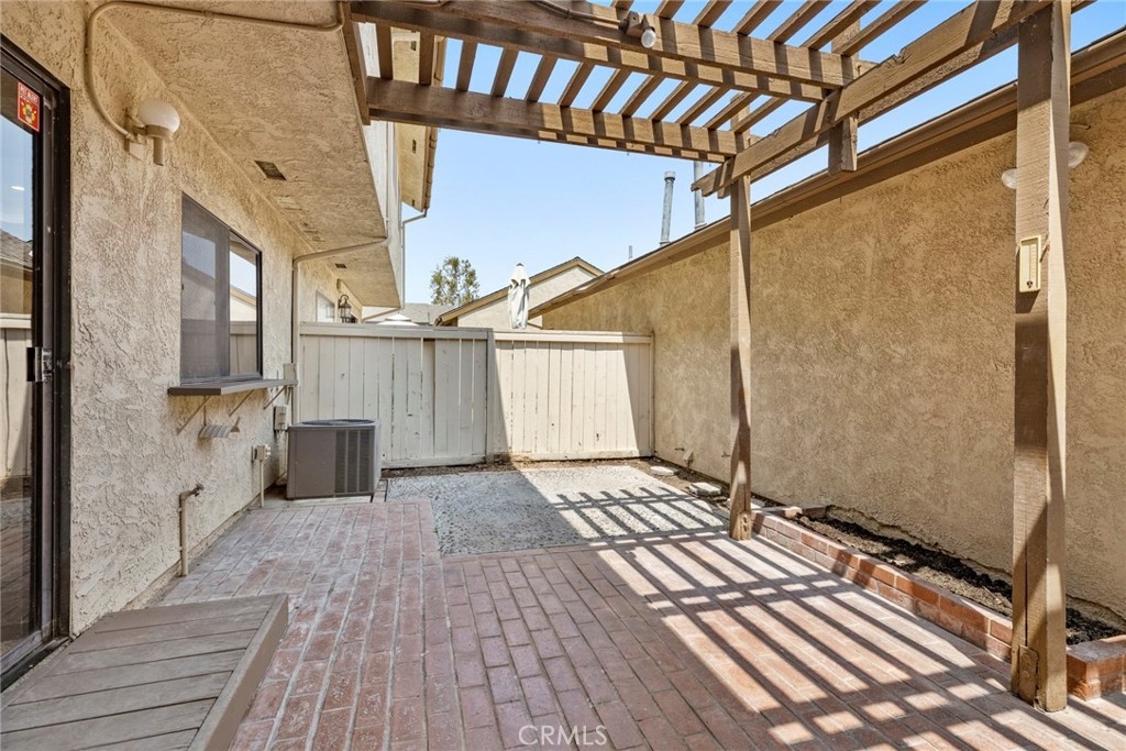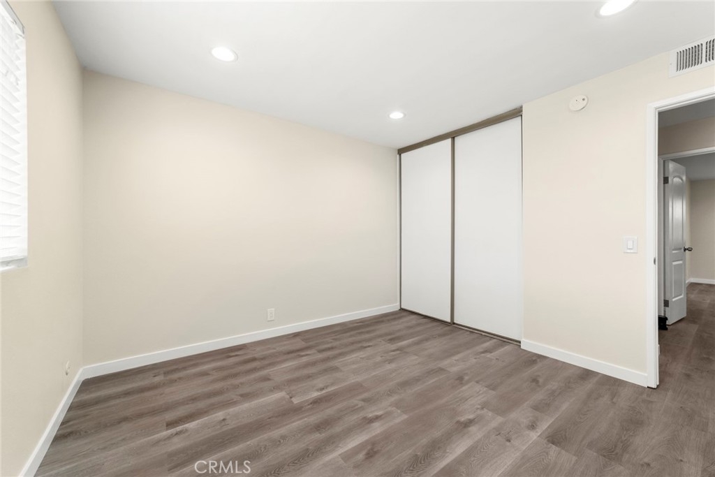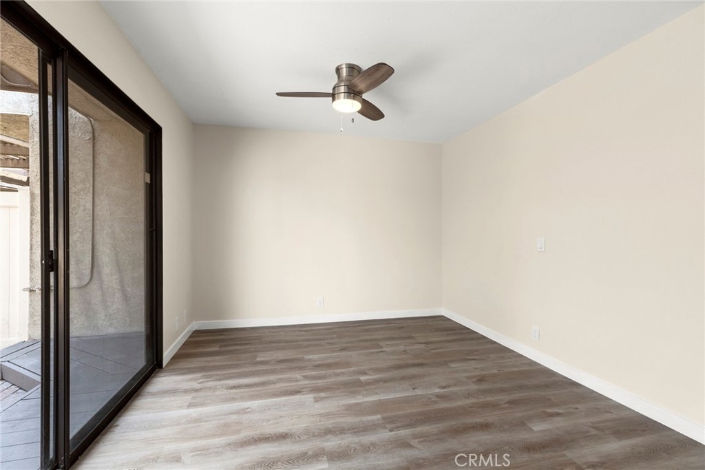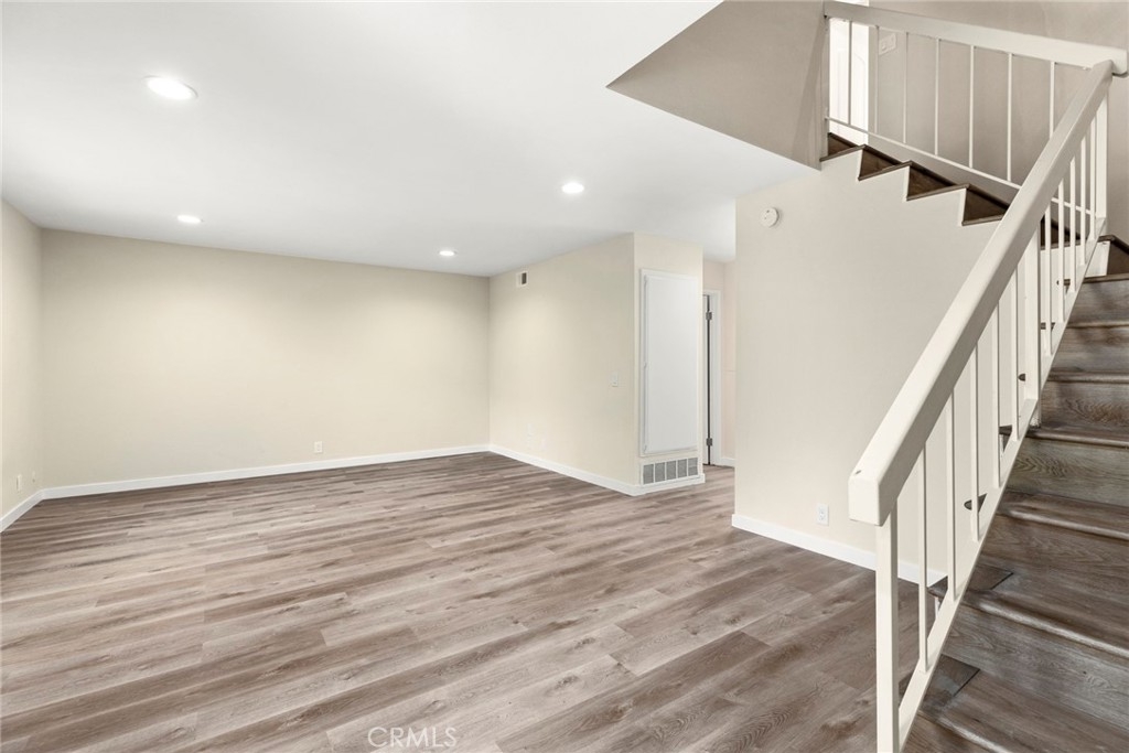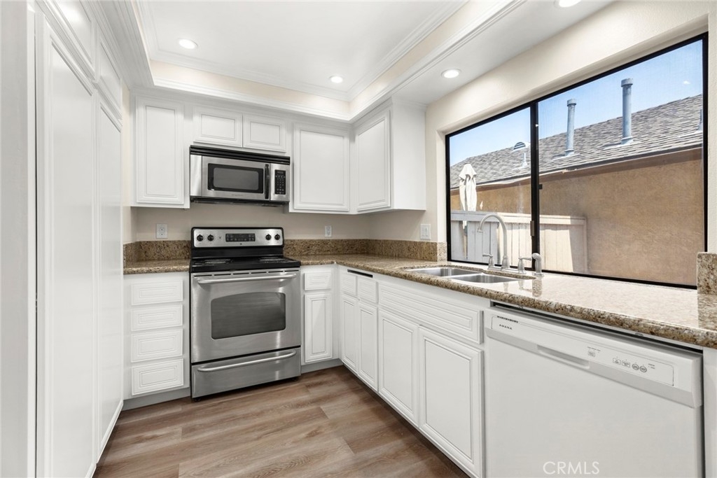 Two-story bright & open townhome located in the Pepperwood Village Complex! This home features 3 bedrooms, 2 1/2 bathrooms, 1446 Sq. Ft., AC, freshly painted & all new laminate flooring throughout. The kitchen has white cabinets, granite counter-tops, dining area w/ceiling fan and sliding glass door leading to the patio. There is also a living room, good-sized 1/2 bath & huge storage closet under the staircase. Upstairs you will find a master-suite with double doors, a huge walk-in closet, all new tiled shower, vanity & fixtures. There is also 2 additional bedrooms, a hall bathroom, & a linen closet. There is direct access to your 2 car garage with an opener, workbench & laundry hookups. Great starter townhome or perfect for those who are ready to down-size! Enjoy all Anaheim has to offer... Disneyland Resort, Packing House, ARTIC, Honda Center, restaurants & breweries.