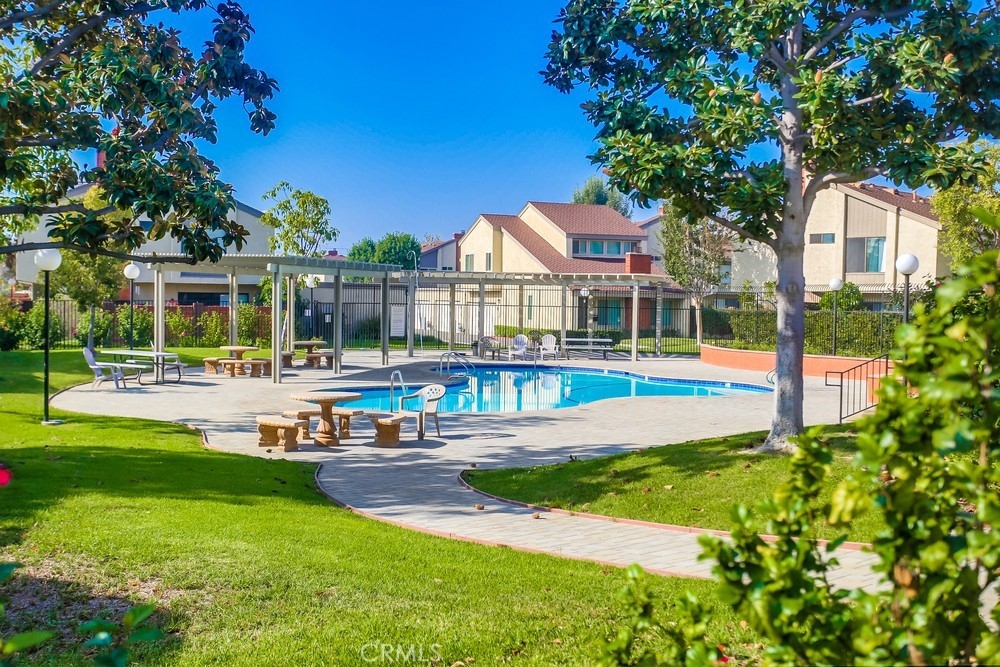 Welcome to Sherwood Village . This is a meticulously cared for community of 221 Townhomes with private patios and 2 car attached garages. The community also boasts a completely renovated pool area and club house that can be reserved for private functions. This is an end unit allowing for more natural light and only 1 common shared wall. The living room features cozy fireplace and room for large sectional and extra seating. Kitchen overlooks living room with open bar seating and separate dining area. Sliding glass doors open to covered patio area perfect for BBQ and Alfresco dining. Dues are so low and include water as well.