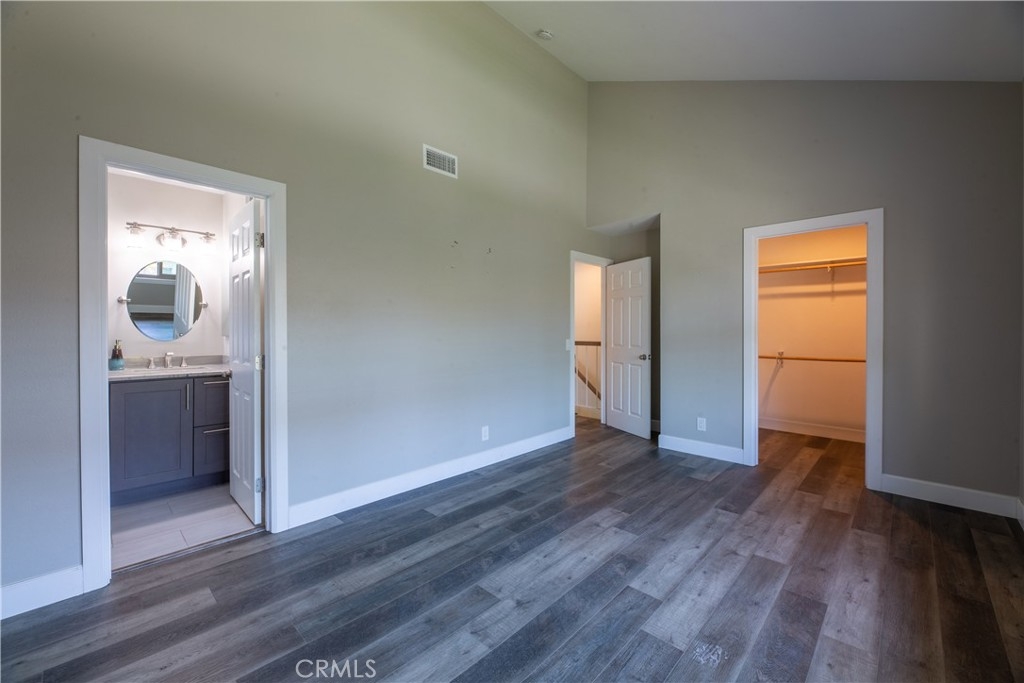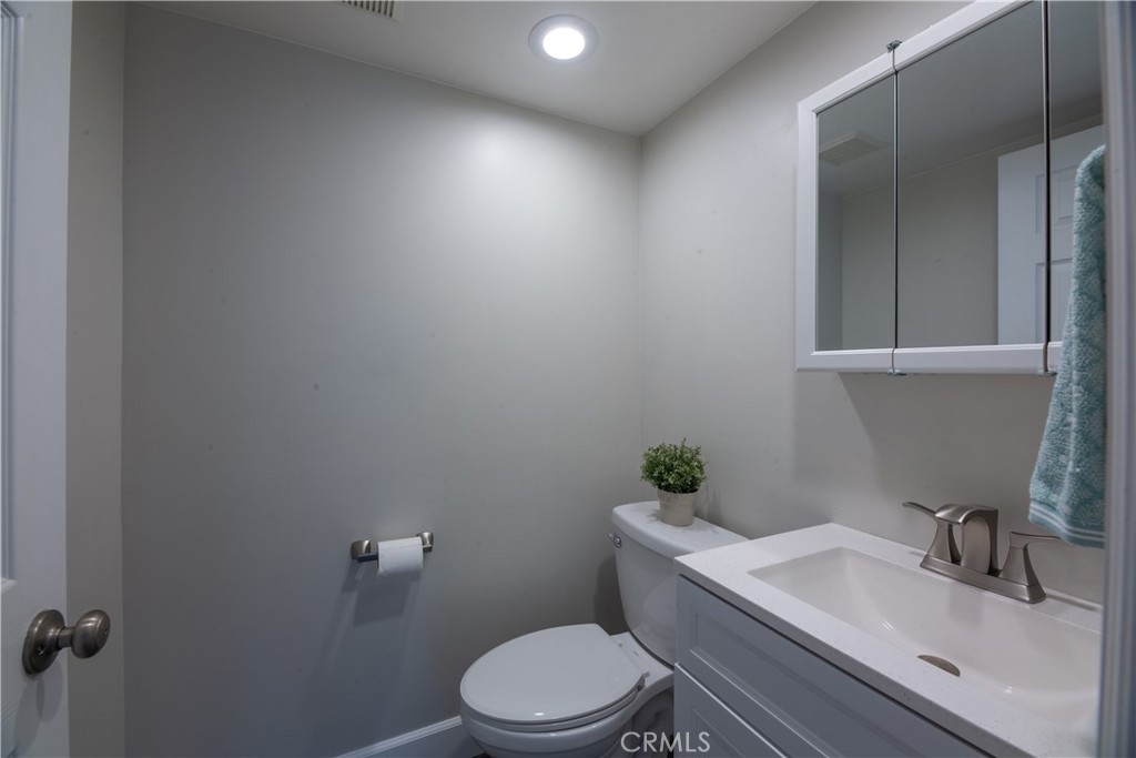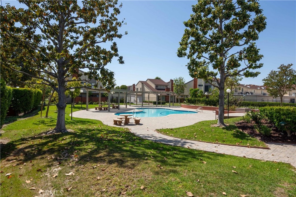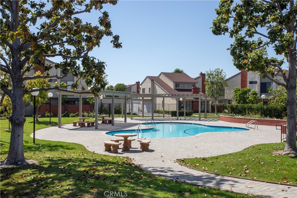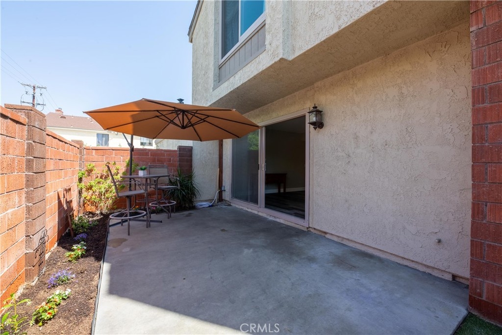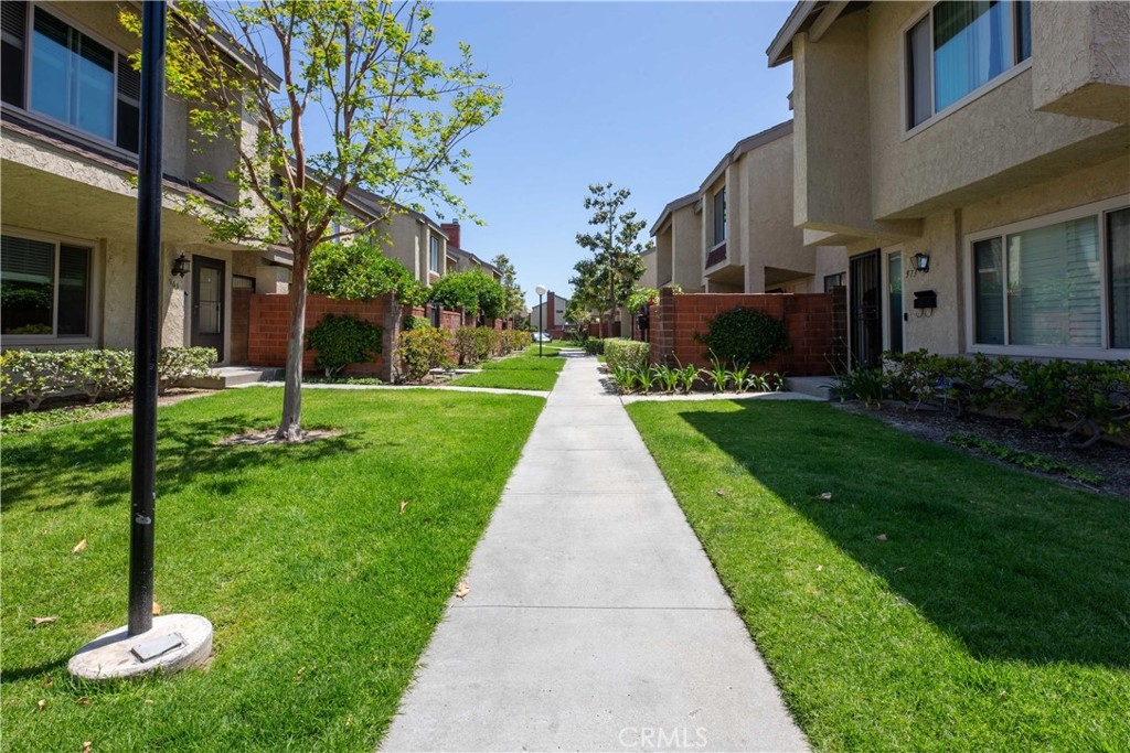 This beautiful end-unit two-story townhome located in a quiet corner of Sherwood Village features plenty of space to entertain, work from home, or raise a family. The home is light and bright and very welcoming as you enter the home. The large living room features a gorgeous fireplace with a custom-built mantle perfect for a warm cozy night by the fire. The wood laminate flooring found throughout the home is as gorgeous as it is easy to clean. The dining room is open to the kitchen and living room and to the sliding glass door leads you out to the private back patio. The updated galley kitchen has an eye-catching ceramic backsplash, farmhouse sink with single-handle spring neck pull-down kitchen faucet, quartz countertops, plenty of cabinet space, and stainless-steel appliances including stove, microwave, and dishwasher. The master bedroom has a large walk-in closet, and a master bathroom with a quartz countertop sink, newer vanity, a spacious walk-in shower with beautiful rock design inlay with gray subway-style tiles, shampoo niche and sliding glass door. The second-floor bathroom features a deep bathtub and shower with subway tile surround great for soaking after a long day. The home comes equipped with ample storage upstairs and down, central A/C, a two-car garage with direct access to the home, as well a 1HP garage door opener with Bluetooth that connects your phone directly to the garage door, which makes it convenient to operate. Out back on the private and open patio you will find a xeriscaped space surrounded by a red brick wall with space to hang planters and have a small herb garden or your favorite flowers. The lawn is made of synthetic grass, making it an easy-to-maintain property. As a planned development community (PUD), Sherwood Village offers a wide variety of accommodations and amenities such as a spa, recreation room, community pool, guest parking, clubhouse, outdoor BBQ, and picnic area, low HOA fees, and so much more! You will have direct access to the freeway, shops, and restaurants and the neighborhood is within minutes of Disneyland, the Anaheim Convention Center and surrounding hotels, and California Adventure. This home is move-in ready and waiting for you!