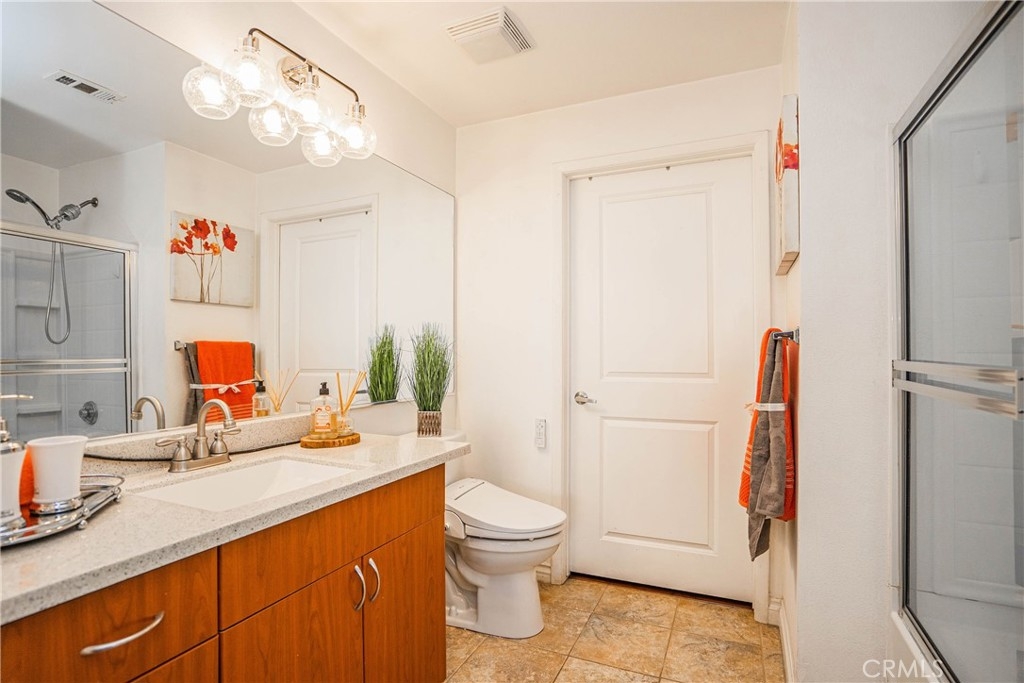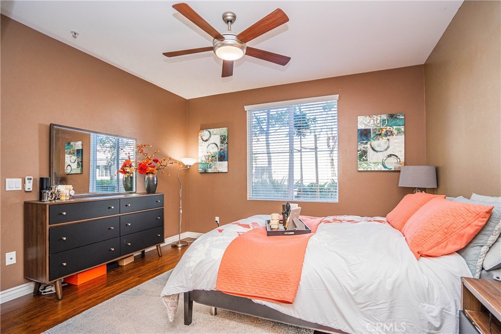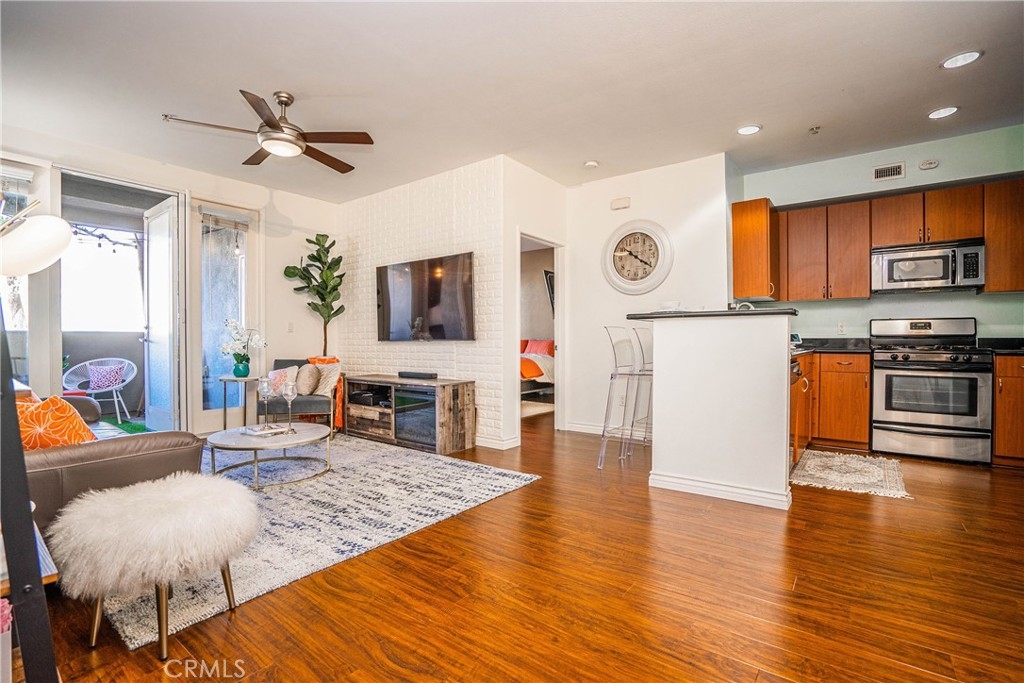 Welcome to urban living at Stadium Lofts and this COMPLETELY renovated and sophisticated floor plan. With 2 bedrooms and 2 full bathrooms, this bright unit has a easy access of first-floor location. You will not find a unit in better condition and there is literally nothing left to do! Upgrades include wood like flooring throughout, newer lighting fixtures, ceiling fan, granite countertop in kitchen, quartz countertop with under mount sink, newer faucets, retro lighting fixtures, glass shower doors, tile flooring. Two spacious bedrooms with large walk in closets in both with direct bathroom for master and also the full bathroom for the other. This unit also comes with storage closet off the patio and tankless water in the closet. Only few unit with THREE parking is assigned in a multi-level structure with plenty of guest parking and 2 security gates. Main level has restaurants and bar-Zov's. Association's truly resort-style living with the giant tropical pool area, lush gardens, many BBQ area, lobby, media center, fitness center, sauna and a recreation room with kitchen and lounge seating including Hi- speed internet. The Stadium Lofts is in the growing Platinum Triangle community of Anaheim and within walking distance to eateries, pubs, Orange Block Outlet, Angel Stadium and the City National Grove performance venue, Honda Center (home of the Anaheim Ducks), the Disneyland Resort, the Anaheim ARTIC Transportation Center and quick access to the 5 and 57 Freeways.