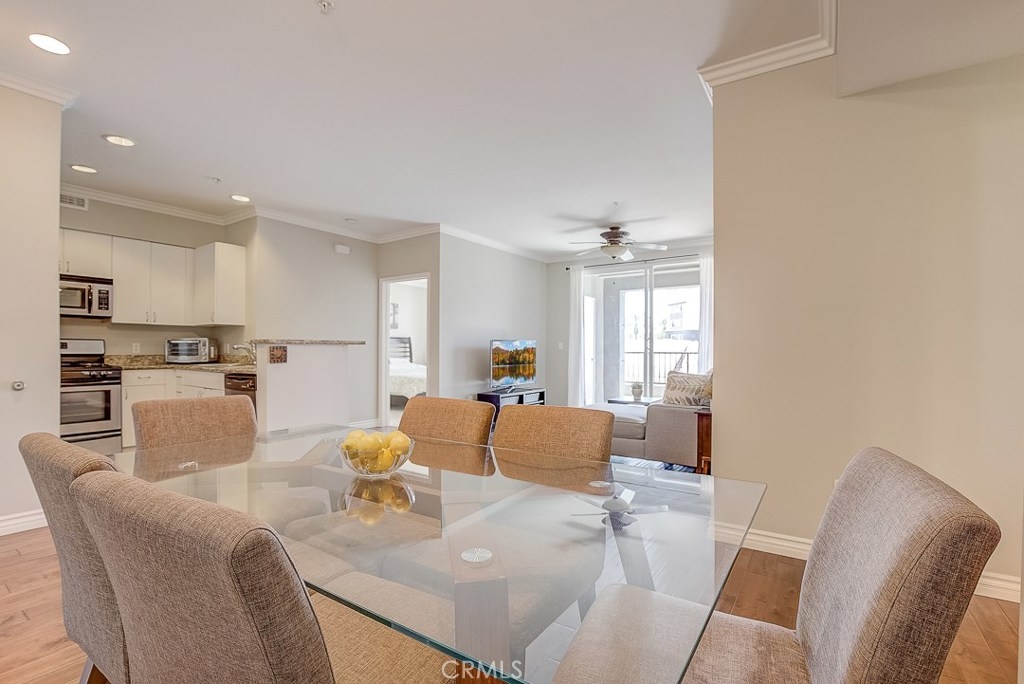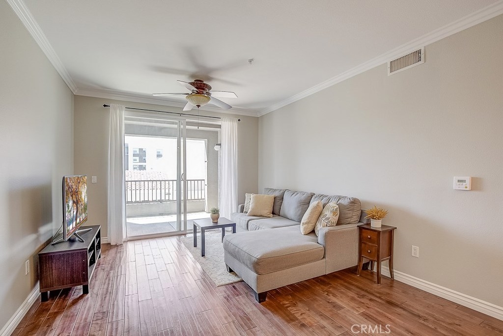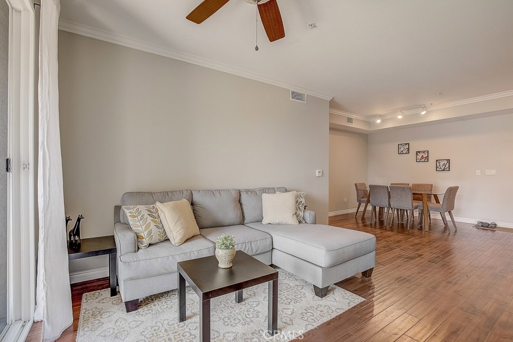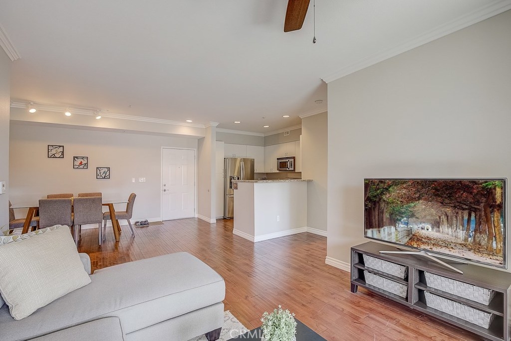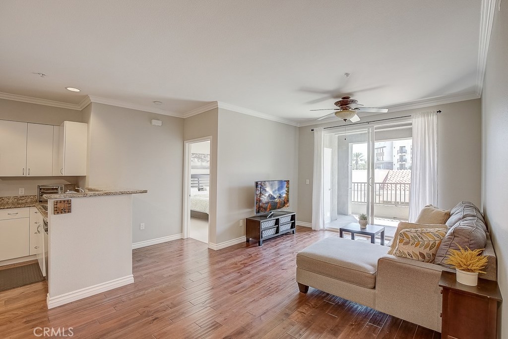 Beautiful single level condo end unit located within the highly desirable community of The Anaheim Stadium Lofts. This amazing home features soft neutral tones, crown molding, recessed lighting and gorgeous wood flooring throughout. Large windows bask the home in an abundance of natural light and illuminate the open candlestick floor plan. A beautifully appointed kitchen with crisp white cabinetry, granite countertops, stainless steel appliances include a gas single oven range, dishwasher and microwave. The breakfast counter seating sits adjacent to your dining and living room area and access to the outdoor balcony with storage. A private master suite boasting an ensuite master bath and walk-in closet. The spacious second bedroom has direct access to the full bathroom. Inside laundry area, A/C, tankless water heater, additional separate adjacent storage unit and two parking spaces. Community features resort style pool & spa, sauna, gym, game room with pool table, shuffle board table and kitchen island, clubhouse room, bicycle parking, courtyards with BBQ grills, business center and fire pit which are located close by. HOA includes water, internet service and Luxer One Package Lockers. Nearby entertainment is Angel Stadium, Anaheim Garden Walk, Century Stadium Promenade, The Honda Center, The Grove of Anaheim, Downtown Disney, Disneyland, Outlets of Orange are all around the corner. Easy access to Public Transportation, the Amtrak and the 5, 57 and 22 Freeways.