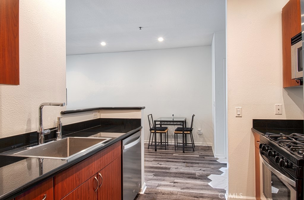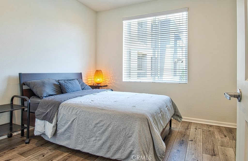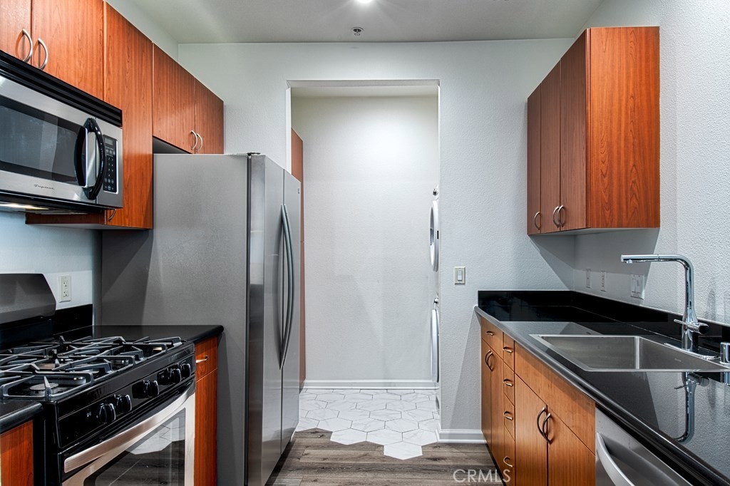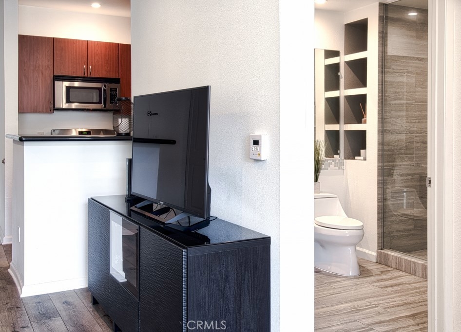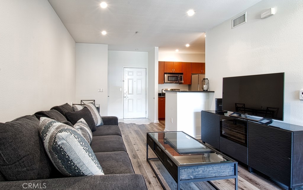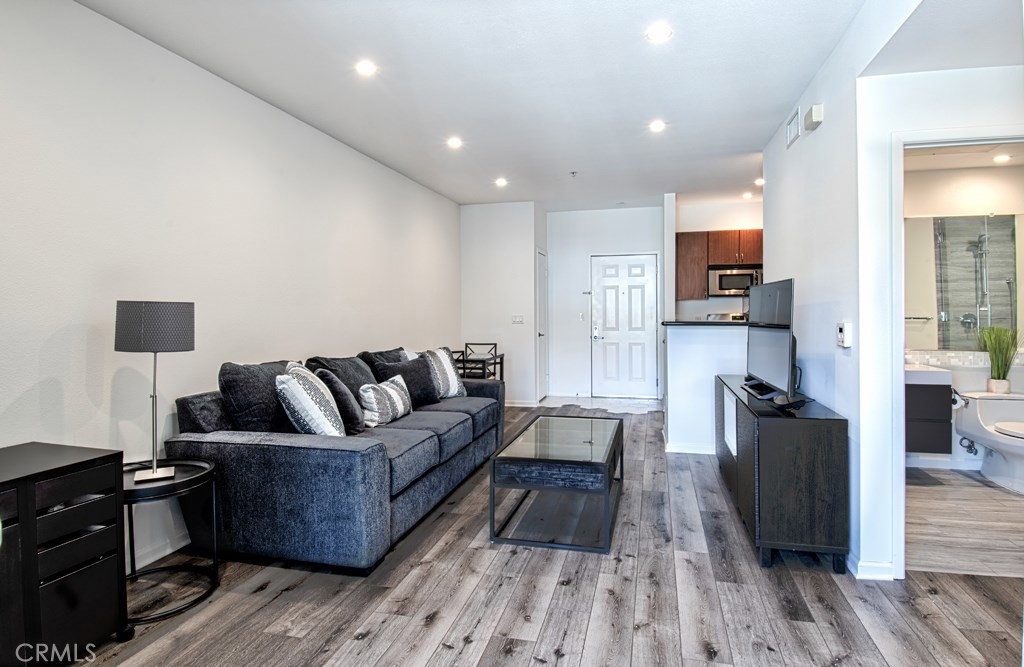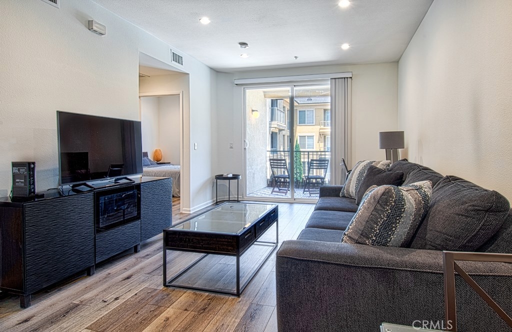 This upgraded third floor Stadium Loft condominium is move-in ready, with an excellent location. Spaciously modern, one bedroom unit includes a beautifully remodeled bathroom, upgraded wood and decorative tile flooring, a rear patio balcony overlooking the courtyard and resort pool area. Unlike most units which only have a single parking space, this unit includes TWO PARKING SPACES (rarely offered) in the gated, and secure structure. Other features include, end unit location, third floor elevator access, inside washer, dryer, refrigerator, gas range, microwave. Resort style amenities with pool, spa, clubhouse with full kitchen, well equipped gym, sauna, game/entertainment room and more. HOA fees include free internet, trash and water. Centrally located close to Angel Stadium, restaurants, The Grove, Disneyland and Honda Center. Perfect as a primary or weekend home. Your kids going to university? This may be cost less than renting, or boarding at Chapman or UCI. Excellent opportunity.