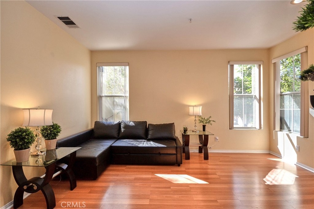 RARE OPPORTUNITY!!!!!! Tri-level Townhouse END UNIT 3 bedrooms, 2.5 baths + bonus room/Office on garage level. Master bedroom is spacious with private bathroom and full walk in closet. Other rooms are well lit with full size closets. All rooms including garage level Bonus room have central air. Patios in the front AND attached to the kitchen. Attached garage, gated community, close to shopping, Disneyland, 5 freeway and in the heart of Orange County.