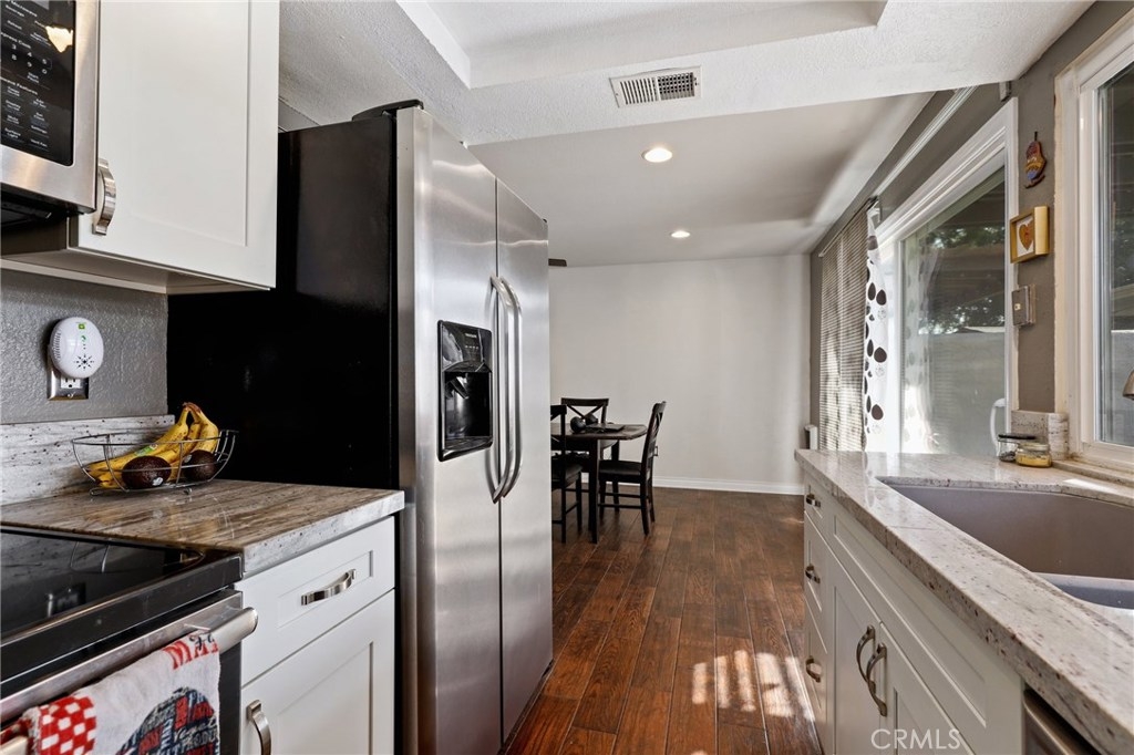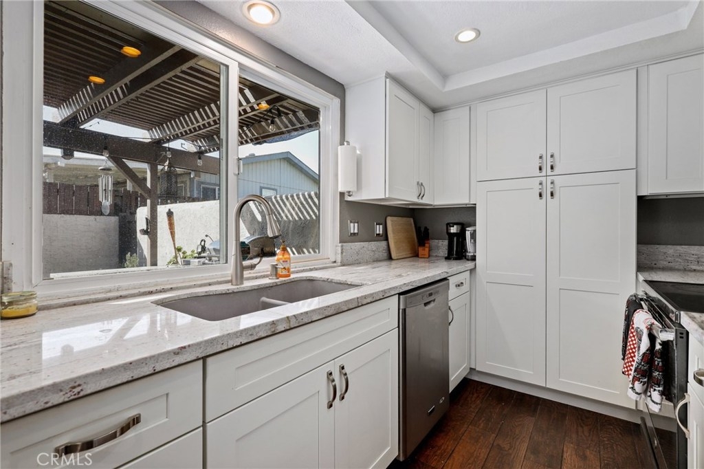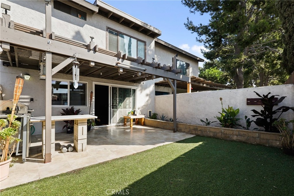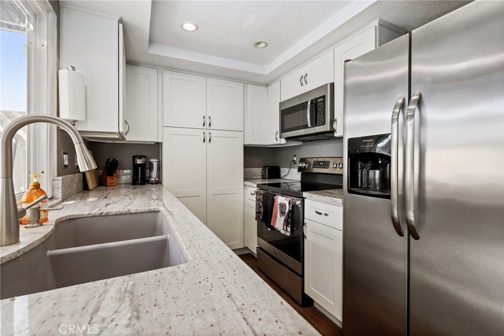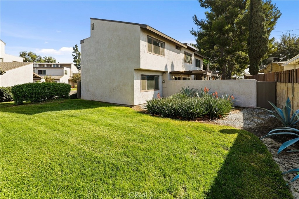 As you enter you will gaze upon gorgeous newer wood floors covering the light and bright living room with large windows that bathe the space in natural light. Recessed lighting and automated ceilings fans throughout the home too. The dining room and kitchen flow seamlessly together for ease of daily living. The upgraded kitchen features granite countertops, crisp, white cabinetry, stainless steel appliances and a tray ceiling with recessed lighting. Three bedrooms and a full bathroom are upstairs. The bathrooms have been upgraded with modern flair. Enjoy the private, fenced yard with turf and stone patio. Imagine yourself sitting under the covered patio in your outdoor living or dining space, sipping your favorite beverage and drinking in the idyllic Southern California weather all year long. The attached 2 car garage provides extra storage space and convenience. The community offers its residents a sparkling pool and spa. Quick freeway access will make commuting a breeze. Close to shopping and dining venues too. Only 6 miles from Disneyland! Don’t let this opportunity pass you by!