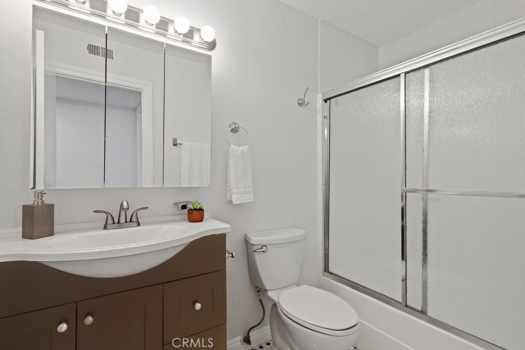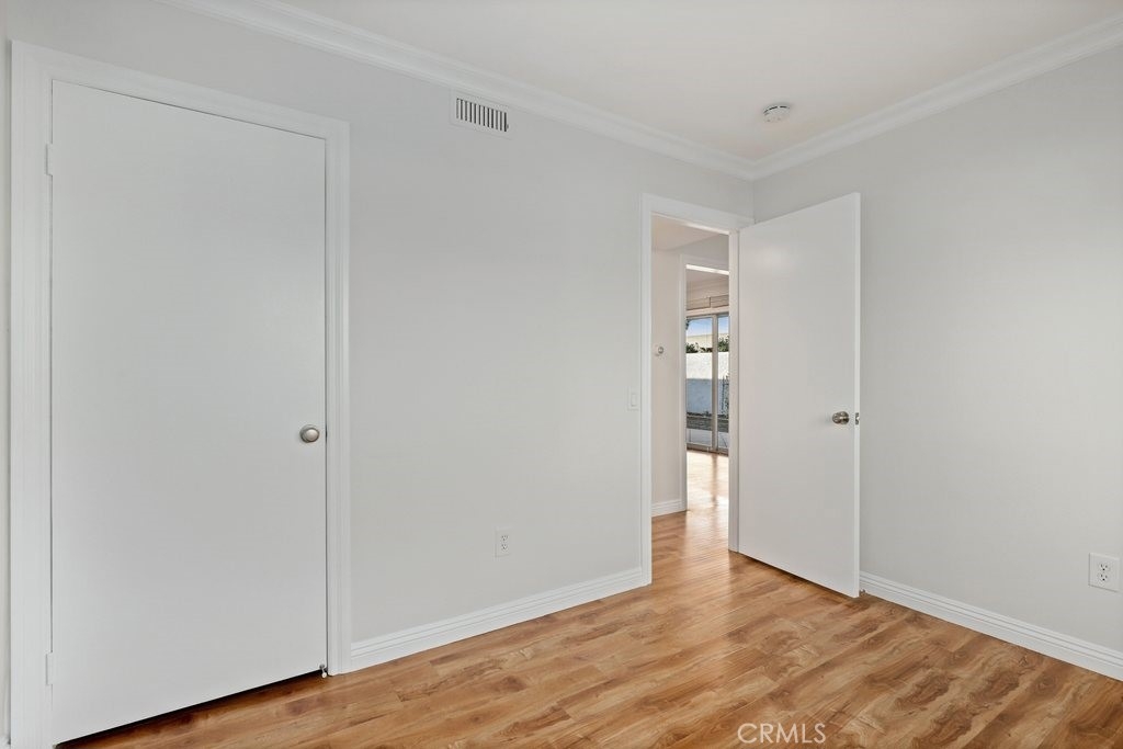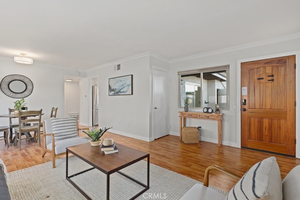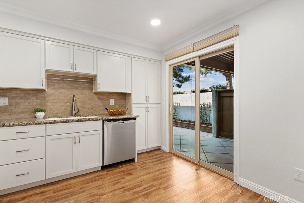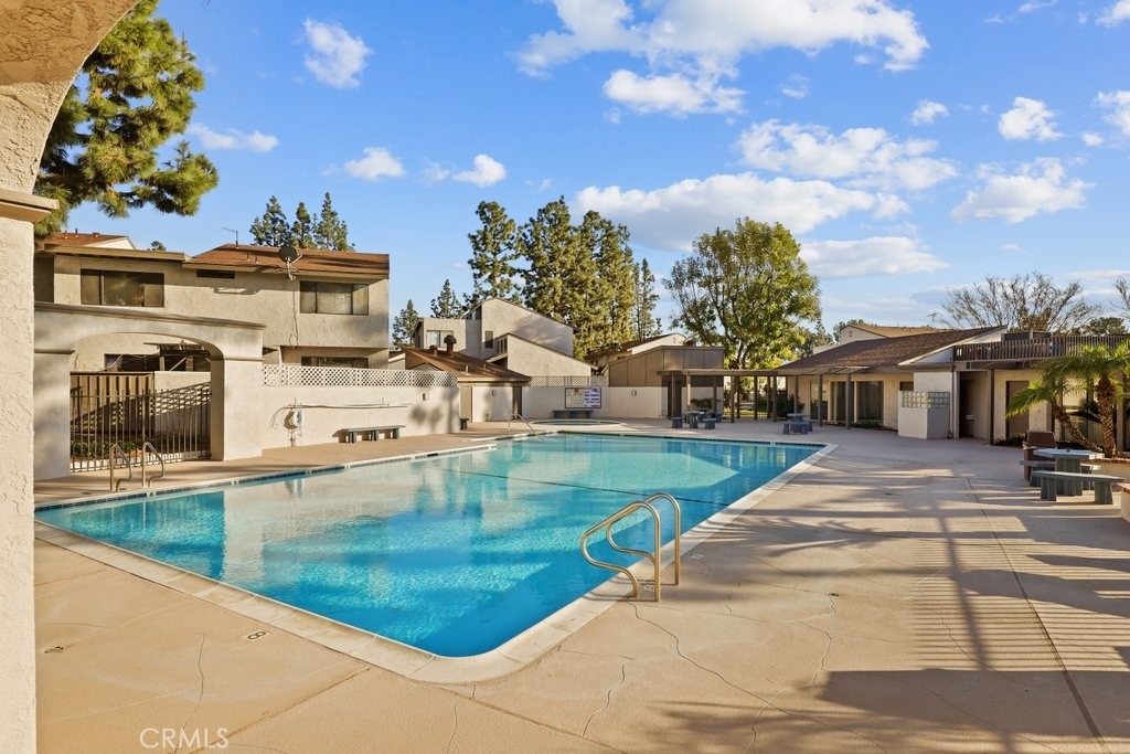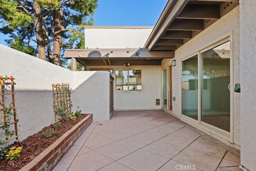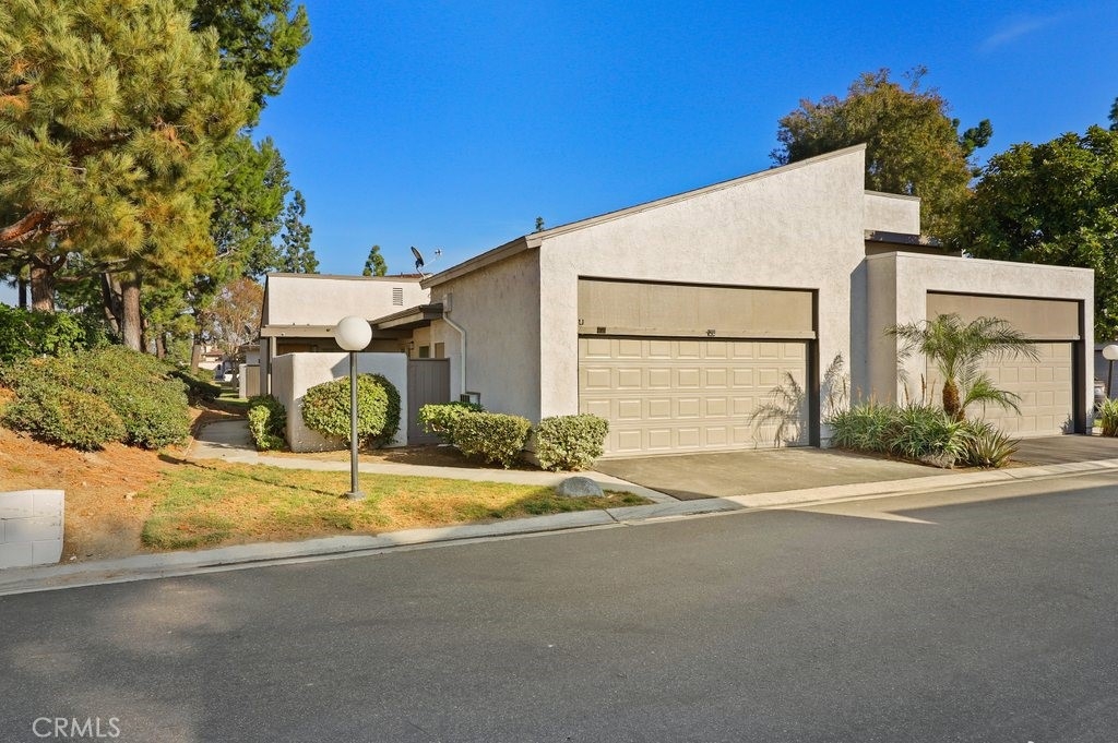 A beautiful home in the Villa Frontera complex features upgraded laminate flooring, crown molding and white bright tones throughout. The large light-catching windows allow an abundance of natural light to illuminate the open floor plan. A spacious living room with an adjacent dining area flows seamlessly into the kitchen. The kitchen impresses with fresh white cabinetry, designer tile backsplash, granite countertops, stainless steel appliances include single oven range, microwave, dishwasher and refrigerator. Down the hallway, you will find a guest powder room and an updated full bathroom. There are two spacious bedrooms, one primary bedroom features a walk-in closet, large glass slides and views of the beautiful backyard. Relax on the private enclosed patio, access to the 2-car garage with washer and dryer, A/C unit and rain gutters with professionally installed leaf catchers. Close to shopping, dining, and many community amenities including pool, greenbelts and park. Easy access to the 91, 5, 55 freeways and toll road. Your new home welcomes you!
