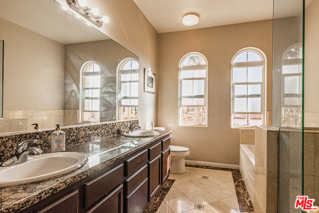 This Excellent home features very Bright, Open floor plan, Extremely LARGE ROOMS for your comfort and enjoyment. Two master suites, first one is very grand (Approx. 18 x 18 Sq.Ft) with walk-in closet (Approx. 7 x 8 Sq.Ft), dual sink vanity, tub and separate frameless glass shower with polished stone surround. Second master suite, which is also very spacious, measures approx. 15' x 16'. The 3rd room on 2nd fl. is also spacious size to use. There is a huge open space for exercise, meditation/yoga, office, play, Good size of a den, using as a home office room, is located on 1st fl. Other great features include entertainment nook in living room, maple cabinets in kitchen with granite counter, recessed lights, patio. very convenient location very close to freeway access. Please see https://youtu.be/-4WNGwCDLWM for more info