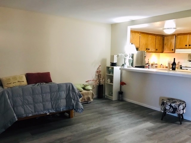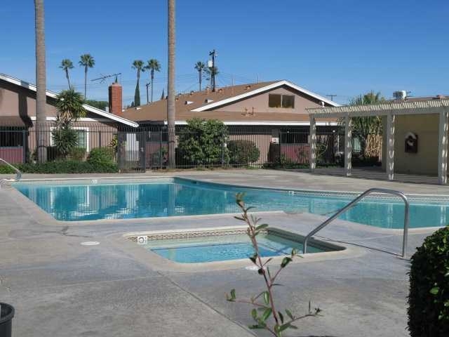JUST FELL OUT OF ESCROW, ACT FAST, THIS WILL GO QUICKLY! Very private and well-maintained single level 1 bedroom 1 bathroom condominium with 504 square feet and no units above. Featuring durable ceramic tile and laminate flooring throughout, this unit also has brand new flooring in the front living room area. This move-in ready unit is ideally situated in Orange County close to shopping, restaurants, freeways, work and Disneyland. Great primary residence or very rentable investment property. Open kitchen layout with breakfast bar and gas stove. Bathroom is very clean and offers a nice walk-in shower/tub. Vinyl windows throughout, with new window in the front of the unit. Large private porch area provides ample space for lounging, storage and entertaining, with views of the community's grassy area and beautiful foliage. Community has its own pool and spa area. HOA pays for hot water, trash, maintenance of exterior, and common areas. Community laundry.