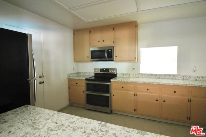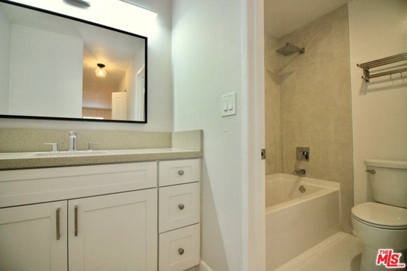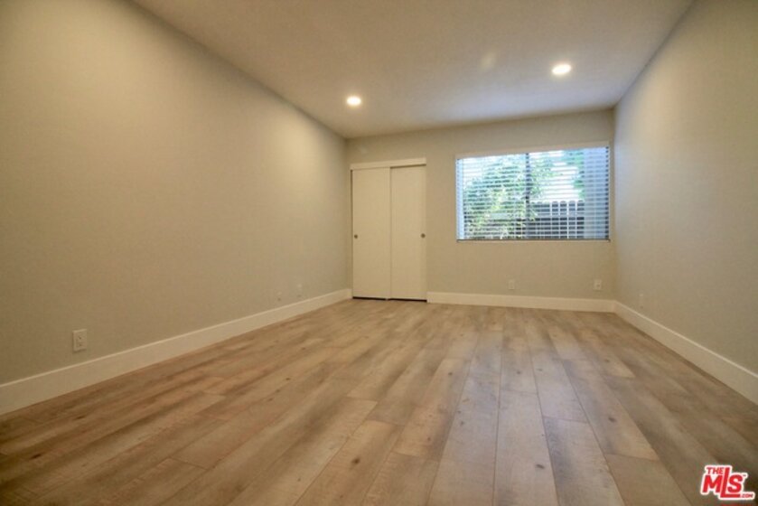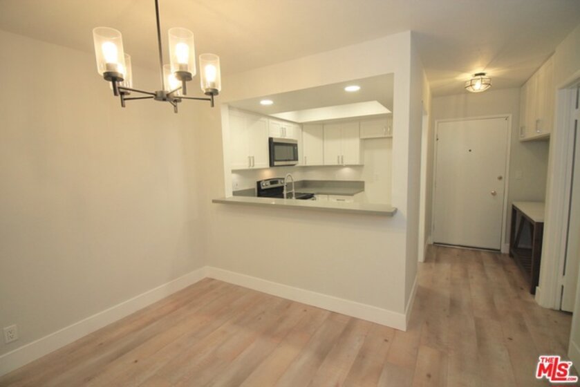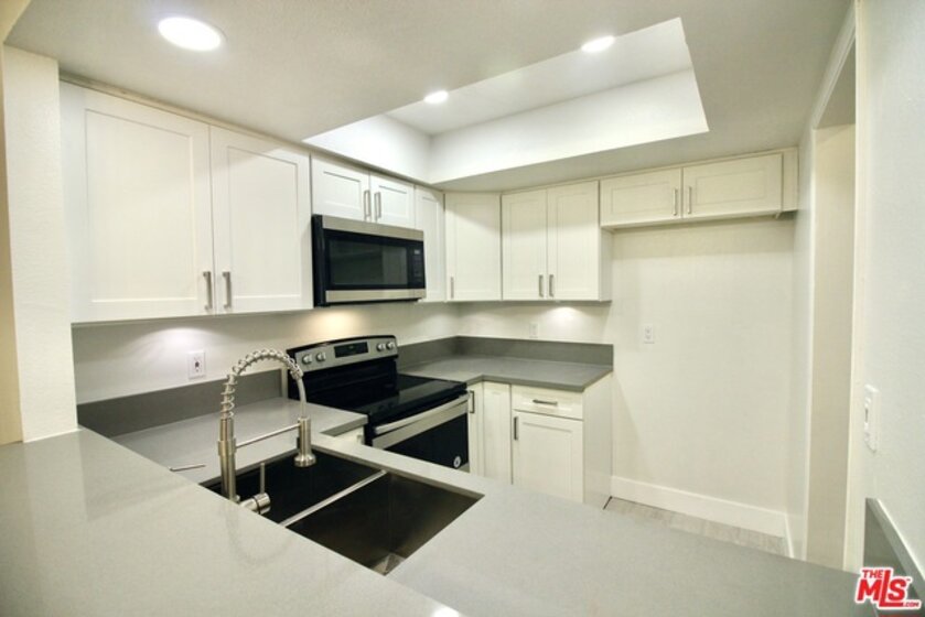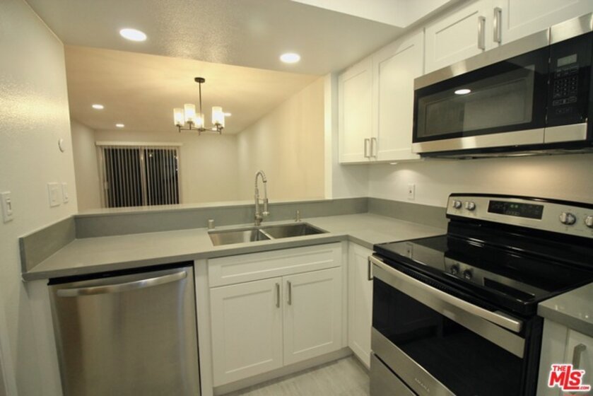 CALL FOR OFFERS! Offer deadline: Tues. 8/13 at noon! This 1st floor, open concept 1 bed / 1 bath has been completely remodeled w/ charm & premium touches throughout. The modern kitchen has been outfitted with brand new white shaker cabinets, quartz countertops, and stainless steel appliances. The kitchen opens up to the dining and living areas via a breakfast bar and features new recessed lights & wide plank laminate flooring. The adjacent rear patio is perfect for a bbq and relaxing; There are no units behind the patio, creating a sense of privacy. The large bedroom also has recessed lighting. and features 2 closets - one of which is a lg. walk-in! The bath also has a brand new vanity with quartz countertop, soaking tub, tile w/ shampoo niche, Grohe faucets & toilet. Completing the unit is central heat/AC, 1 parking spot & extra storage. Well run & affordable ($263/mo.) HOA includes pool, rec. room, earthquake ins., cold water, elevator, and security cameras throughout.