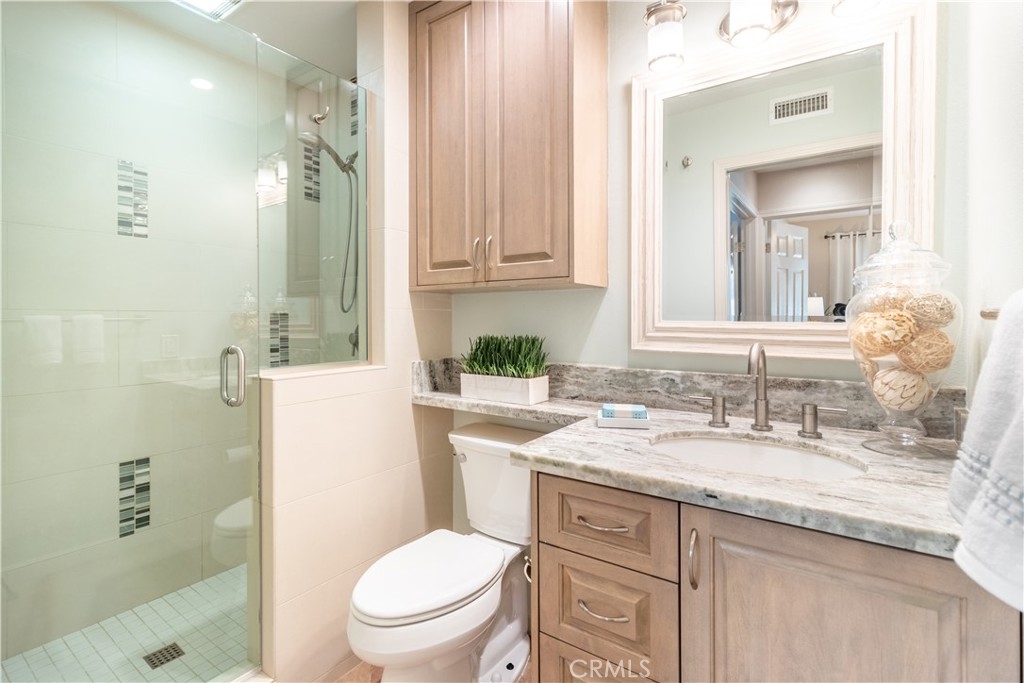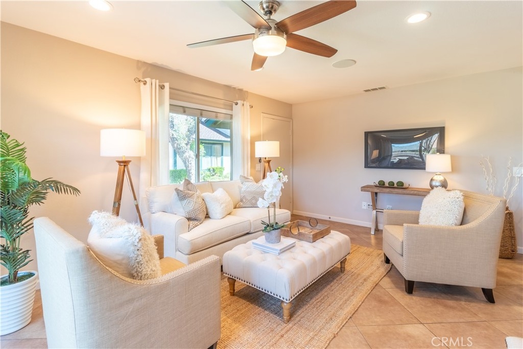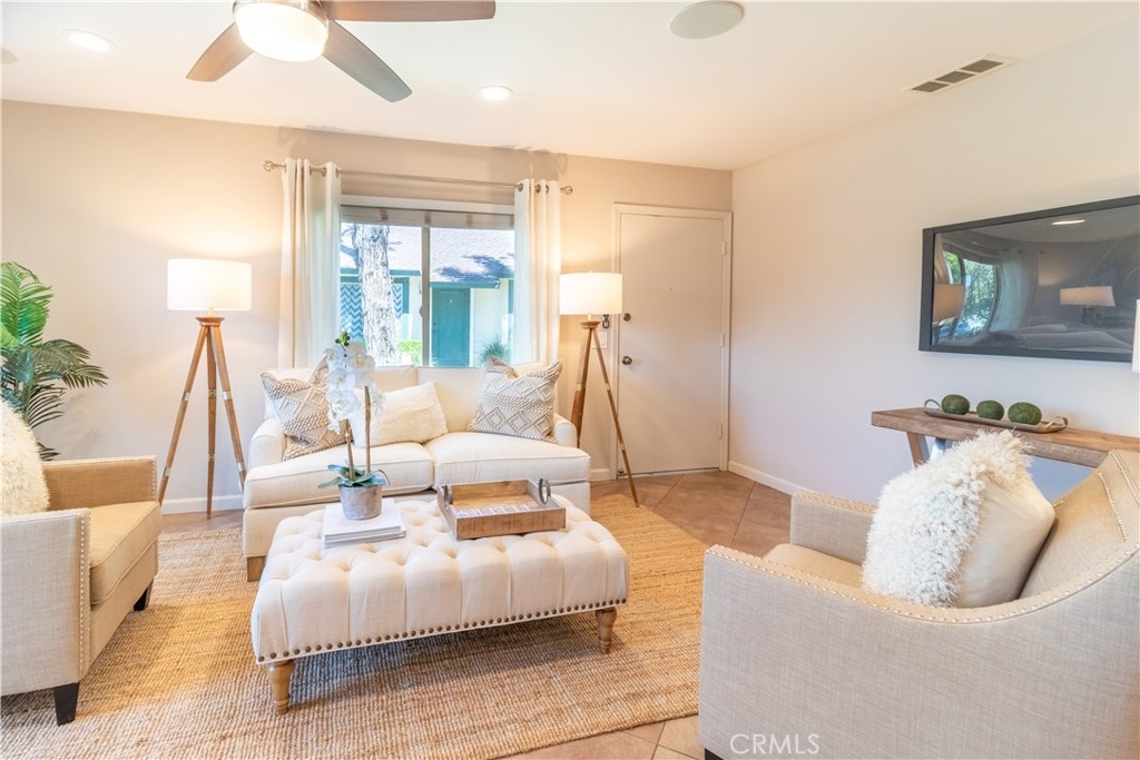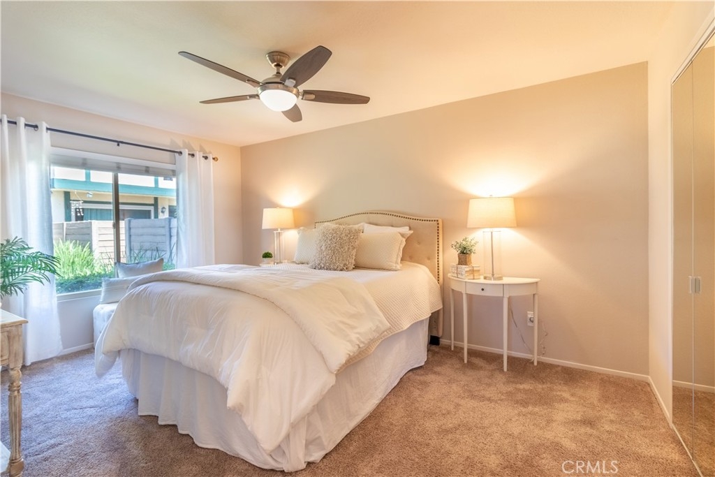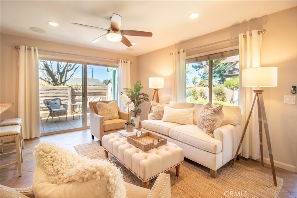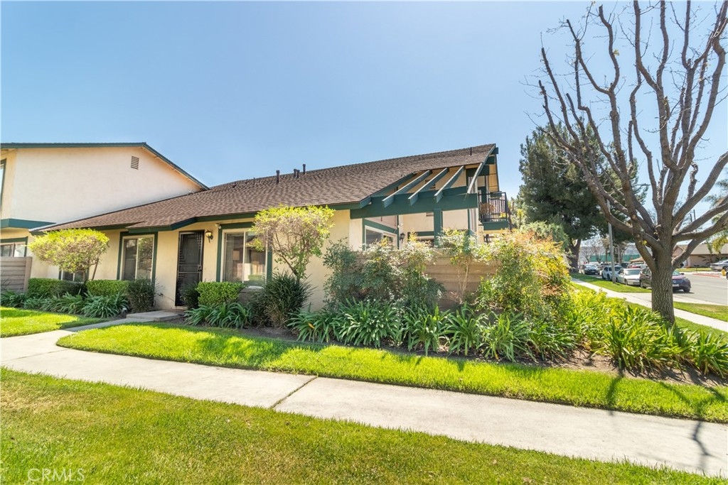 Beautiful 2 bedroom, 1 bathroom, single level, end unit condo in the community of Windwood in Anaheim! This ground-level corner unit is ideally situated with no one above. The open floor plan features a spacious living room, Tuscan-style tile flooring, sliding doors to the private outdoor patio, and an open kitchen. The kitchen offers elegant stone tile countertops, a breakfast bar, dining area, and pull-out shelving. The primary bedroom features a large walk-in closet, full length mirror, and carpet flooring. The bathroom has been beautifully updated with custom cabinetry, a marble countertop, floor to ceiling stylish tile shelving, a marble “seat” in the custom shower, dual shower heads, and custom lighting. Additional property highlights include the full-size laundry room with newer cabinetry, newer remote-controlled ceiling fans throughout, Nest system, recessed lighting throughout, a 1 car garage, and one additional assigned parking space. Windwood Community amenities include the swimming pool, spa, serene greenbelts, and walking paths. Convenient to area schools, golf, restaurants, shopping plazas, easy access to major freeways, and centrally located to Orange, Riverside, and Los Angeles counties!