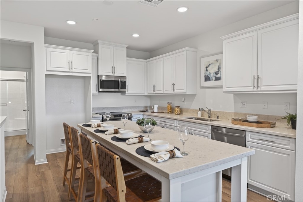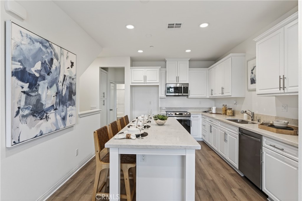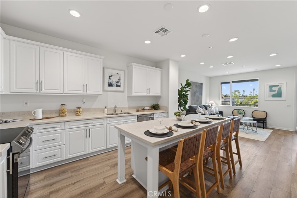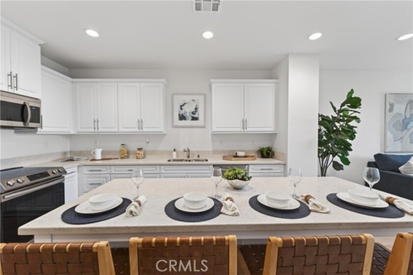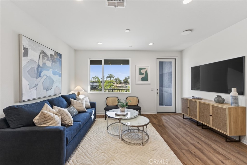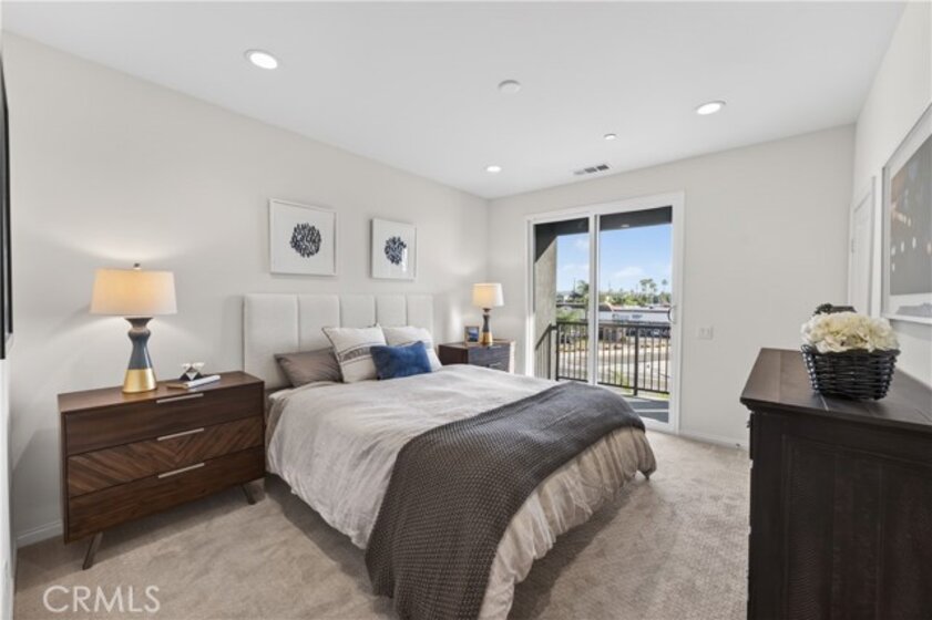 Come see this beautifully designed home with an open floor plan and abundant natural light. The heart of the home is a gourmet kitchen featuring stainless steel Samsung appliances, white quartz countertops, custom tile backsplash, luxury vinyl plank flooring, and a large island that invites both everyday meals and entertaining. The flowing layout with 9 ft ceilings, extends across three levels, culminating in a third-floor primary suite that offers a walk-in closet, plush carpeting, and a luxurious en-suite bath, dual sinks, a vanity, and a walk-in shower. Upstairs the nine foot ceilings complements the layout, adding warmth and sophistication to the living spaces. Additional highlights include a balcony for outdoor relaxing, a solar energy system for efficiency, and LED lighting throughout for modern, energy-conscious living. An attached, tandem, two-car garage provides secure parking and extra storage. Located on Harbor Blvd with easy access to Freeways 91, 5, and 57, this home keeps you minutes from Downtown Fullerton, California State University, Fullerton, and top local attractions like Disneyland and Knott’s Berry Farm. This move-in-ready home blends contemporary finishes with practical convenience, offering a premier lifestyle in a highly sought-after Southern California location.