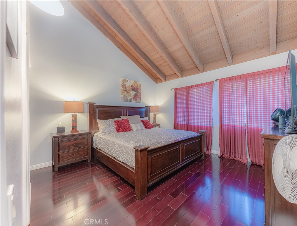 Great condo near Disneyland, in the heart of Anaheim. This home was completely remodeled in 2014, including plumbing, air conditioning, appliances, paint, flooring and more. This is a two story, two bed, and two bath 987 sf condo with vaulted ceilings in the Kaleidoscope community. Open concept floorplan with beautiful new flooring throughout, recessed lighting and lots of natural light. The kitchen has stunning new lacquer wood grain cabinets, deep stainless steel sink, gas range/cooktop, dishwasher, microwave and breakfast bar. Adjacent to the kitchen is the dining area and both flow over into the living room. The living room has sliding glass doors that lead out to the enclosed patio with wood deck. Both bedrooms are spacious and the master bedroom has vaulted, beam ceilings, wood laminate flooring, walk-in closet and en suite with walk-in shower and composite sink. The unit has new a/c and ceiling fans throughout for those warm California days. Unit has laundry inside with washer dryer hookup and one car garage and one assigned parking space directly across from the unit. Private patio for relaxation and watching the Disney fireworks. The community amenities include pool, spa, playground, BBQ facilities and clubhouse. Nearby schools include Palm Lane Elementary School, Ball Junior High School and Loara High School.