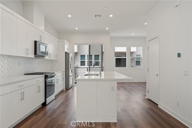 Welcome to this stunning contemporary residence, masterfully crafted by Toll Brothers and nestled within Anaheim’s highly coveted gated community of 100 West. Here, modern sophistication blends seamlessly with resort-style living, offering residents access to a sparkling pool, soothing waterfall spa, lush landscaped greenbelts, a dedicated dog park, BBQ stations, and the security of a gated entrance. The home itself features 4 bedrooms and 3.5 bathrooms, including a convenient first-floor suite ideal for guests, extended family, or a live-in nanny. The second floor embraces an open-concept design with a chef’s kitchen at its heart, highlighted by a grand center island, stainless steel appliances, abundant cabinetry, a large pantry, and ample counter space, all flowing gracefully into a bright, sun-filled living area. The third floor is devoted to the serene primary suite, complete with a spacious walk-in closet and spa-inspired bath with dual mirrored vanities, a glass-enclosed shower, and a rainfall showerhead. The fourth-floor rooftop deck provides a private open-air retreat, perfect for entertaining under the stars or enjoying quiet morning reflections. Fresh interior paint and new carpeting elevate the home’s turnkey appeal, while its prime location just minutes from Disneyland, the Honda Center, Angel Stadium, world-class shopping, dining, top medical centers, and major transportation hubs ensures unmatched convenience. More than a home, this residence is a refined sanctuary where every detail invites comfort, elegance, and a life well lived.
