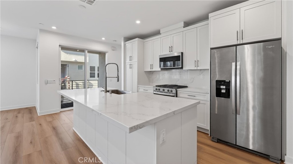 Welcome to 1430 W Cara, a beautifully designed home in the gated 100 West community built by Toll Brothers. From the moment you step inside, the open layout, high ceilings, and natural light create a bright and inviting atmosphere. The home blends style and function with luxury vinyl flooring, recessed lighting, dual pane windows, and efficiency upgrades that include a tankless water heater, owned solar, and a Halo 5 whole house filtration system. The living area features built in surround sound and the spacious two car side by side garage is EV ready, offering flexibility for future charging needs. The kitchen brings a clean modern look with quartz counters, white shaker cabinets, and stainless steel appliances. As an end unit, this home offers additional privacy and a more open feel. The community provides a relaxing pool and spa along with a bbq area perfect for weekend gatherings and a dog park for daily convenience. With shopping, dining, major freeways, and Disneyland only minutes away, this location delivers both comfort and accessibility. This is a wonderful opportunity to own a newer home with upgraded features in a vibrant gated neighborhood.