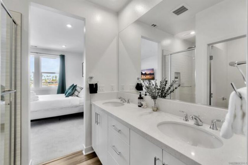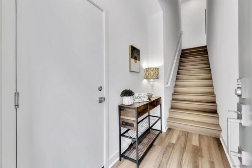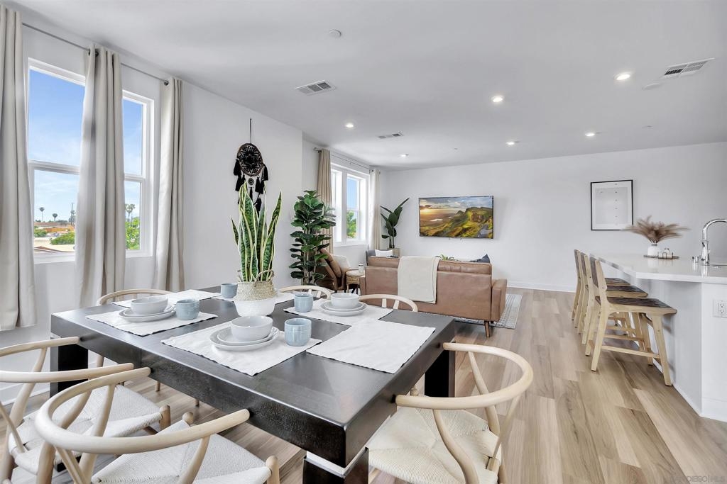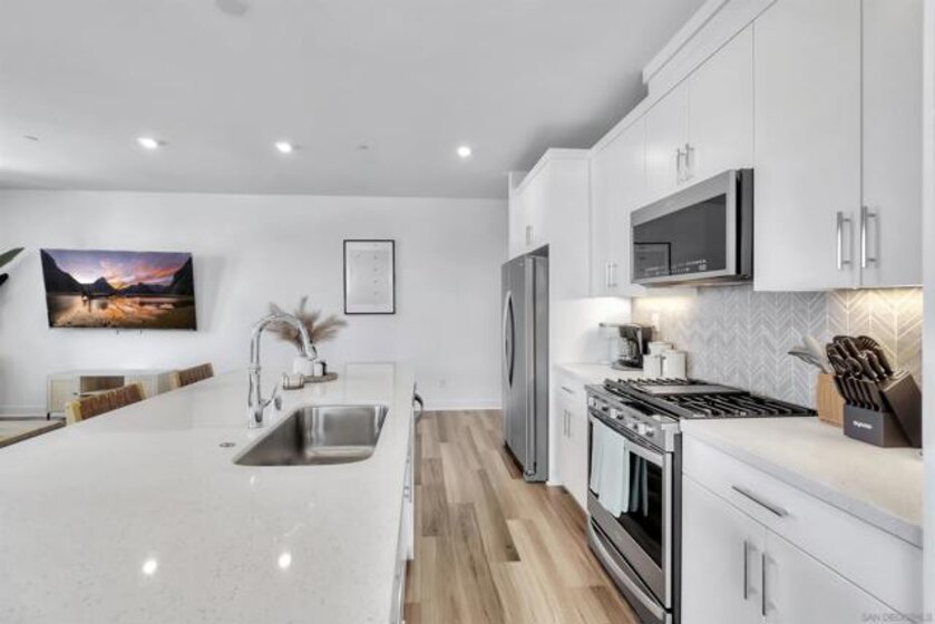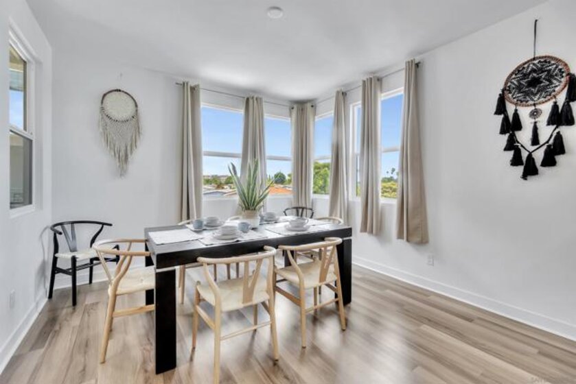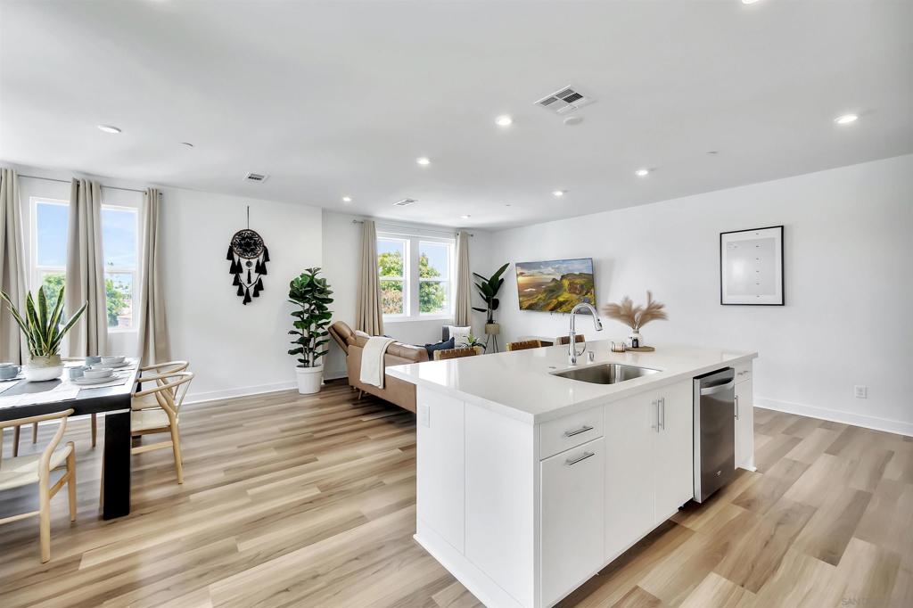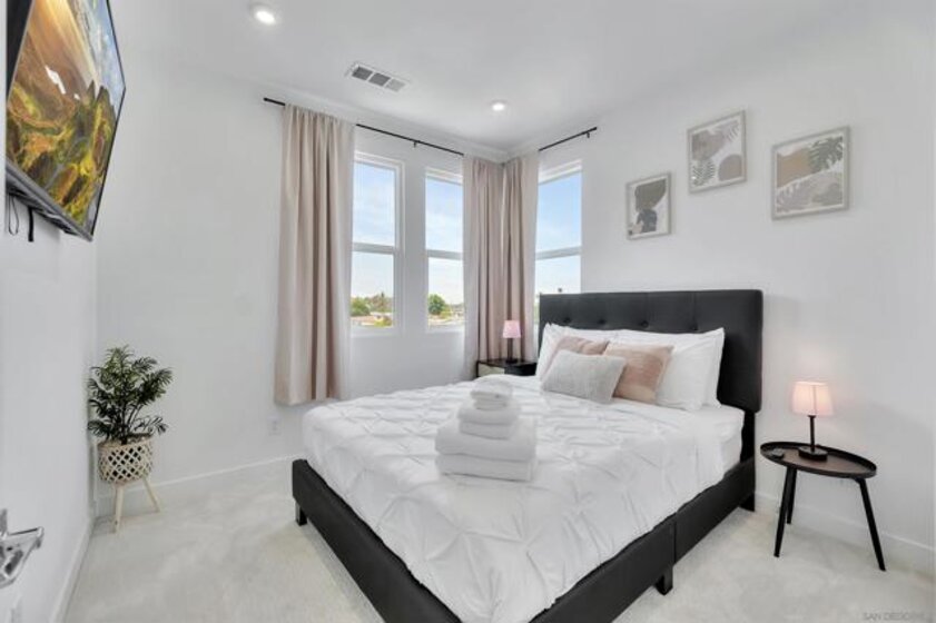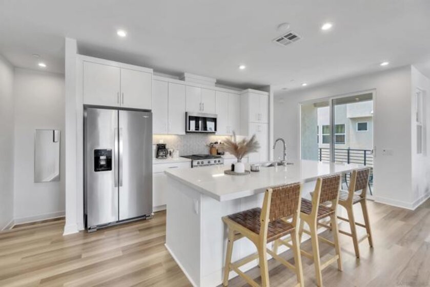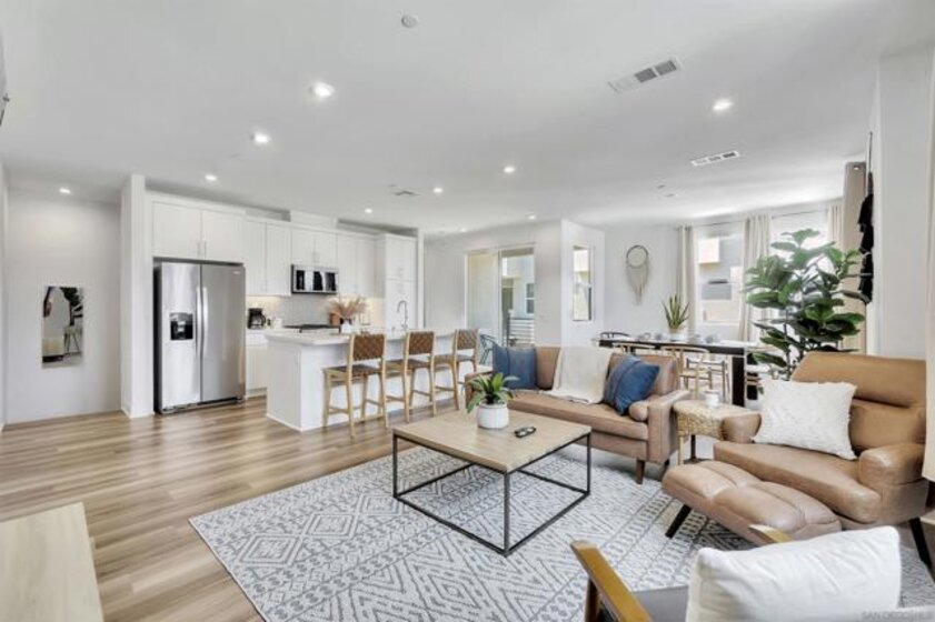 Experience modern living in this bright and stylish corner-unit home built in 2023 by Toll Brothers, located within the exclusive gated community of 100 West in Anaheim. Enjoy unbeatable convenience just minutes from Disneyland, Honda Center, Angel Stadium, and a vibrant mix of dining, shopping, and entertainment. Step inside through a welcoming first-floor entry with direct access to a spacious two-car garage. The second level features a thoughtfully designed open-concept floor plan that seamlessly connects the living room, updated designer kitchen, and dining area—ideal for both everyday living and entertaining. Step onto your private balcony to relax and enjoy the California breeze, while a convenient powder room completes this level. The third floor offers a private retreat with all bedrooms thoughtfully situated together, along with a centrally located laundry closet for added convenience. Carpet has all been replaced with new LVP for a seamless look. Additional highlights include electric vehicle charging capability, a tankless water heater, modern kitchen appliances, and contemporary finishes throughout. Don’t miss this exceptional opportunity to enjoy comfort, style, and a prime location in one of Anaheim’s most sought-after communities.