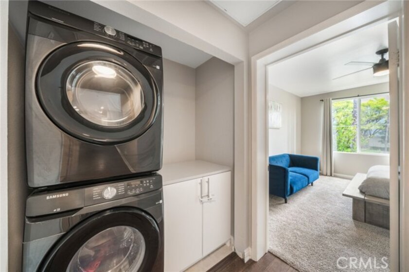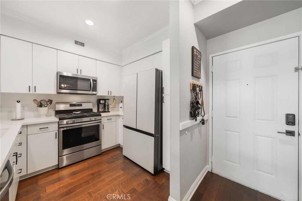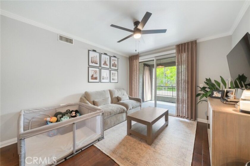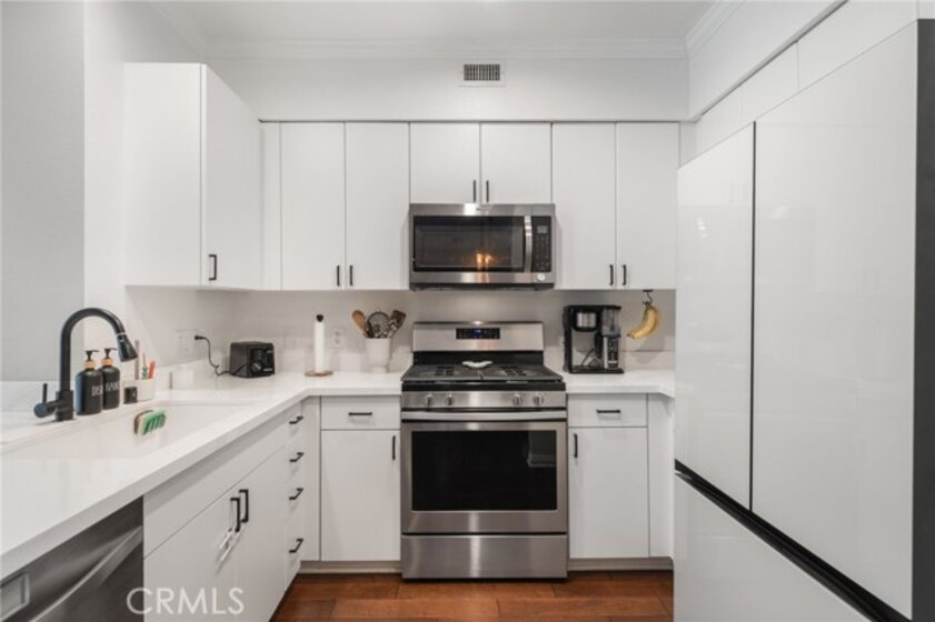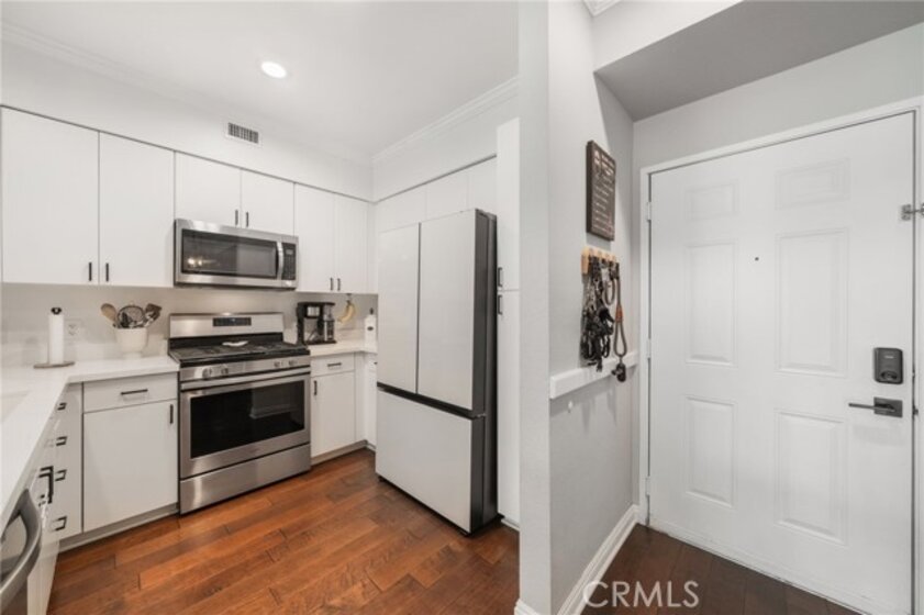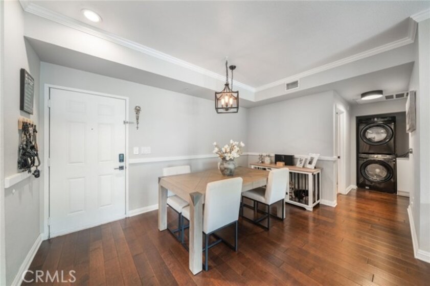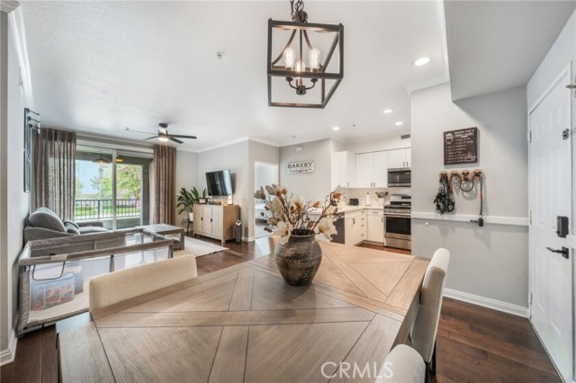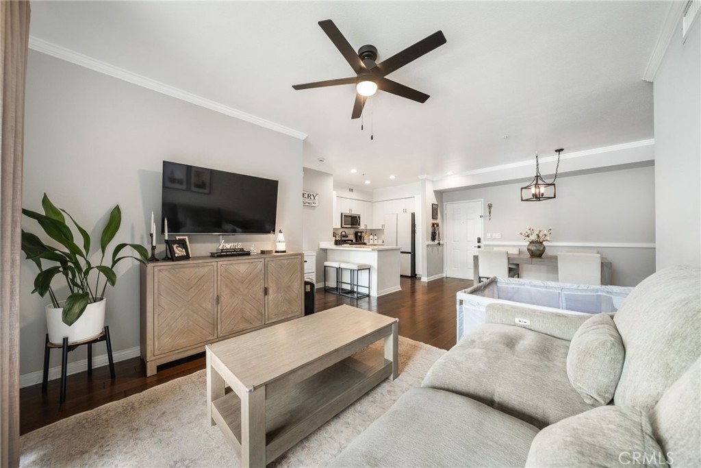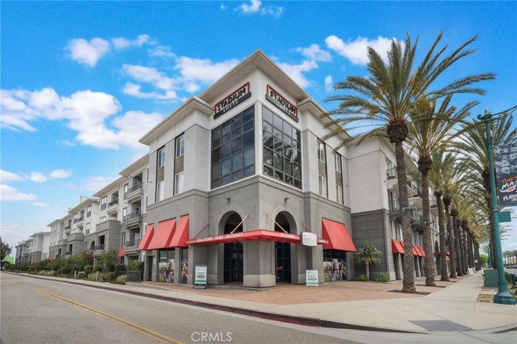 Welcome to Stadium Lofts, where modern living meets everyday convenience in the heart of Anaheim’s Platinum Triangle. This 2-bedroom, 2-bath residence offers an open, airy layout with hardwood floors, crown molding, and a functional design that flows naturally for everyday living. The kitchen has been recently remodeled with sleek white cabinetry, matching appliances, and a refreshed, contemporary feel that ties the space together. Down the hall, a dedicated laundry area accommodates a side-by-side washer and dryer, offering the convenience of in-unit laundry. Life at Stadium Lofts extends beyond your front door. Enjoy resort-style amenities including a fitness center, pool and spa, dry sauna, conference room, game room, landscaped courtyards, BBQ areas, and EV charging stations, all complemented by low HOA fees. Positioned just minutes from Angel Stadium, Honda Center, Disneyland, Anaheim GardenWalk, The Outlets at Orange, and the ARTIC/Amtrak station, you’re surrounded by some of Orange County’s top dining, entertainment, and shopping. Easy access to the 5, 57, 22, and 55 freeways makes commuting simple. VA and FHA approved, offering flexibility for both primary residence buyers and long-term investment potential. Close proximity to Chapman University, West Coast University, and UCI Medical Center adds to the overall convenience and rental appeal.