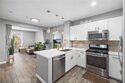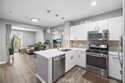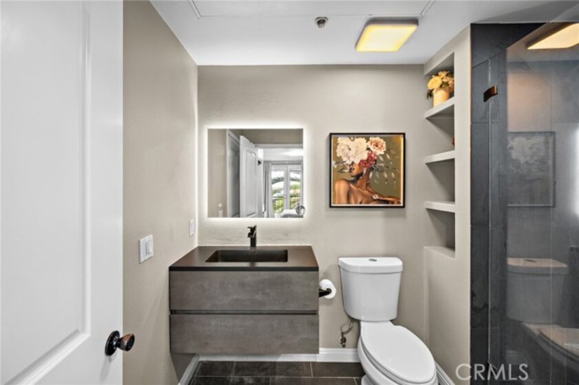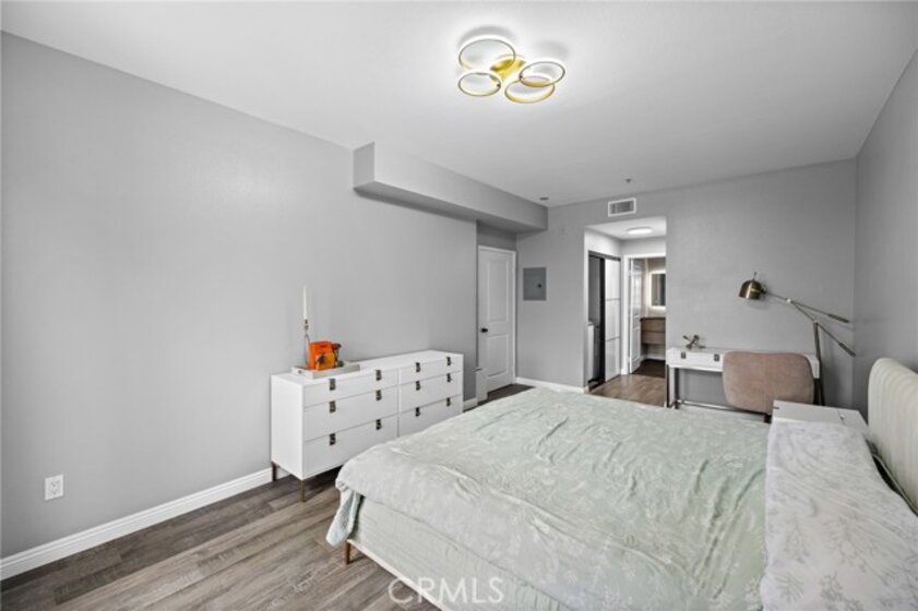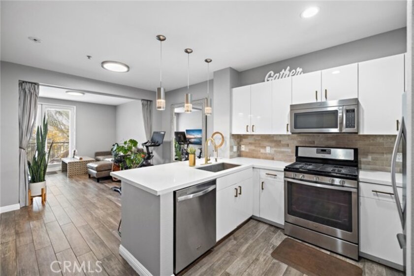 Welcome to this stunning top-floor condominium at 1801 E Katella #4005 in Anaheim, California, where elegance meets convenience. Nestled in the highly sought-after Platinum Triangle neighborhood, this meticulously remodeled home has wonderful city views and boasts prime access to parking, an elevator, and storage, making it a true gem in the community. Step inside this delightful 784 square foot home, adorned with exquisite porcelain flooring that flows seamlessly throughout. The living space is bathed in nourishing natural light from large glass French doors that invite you to unwind on your private balcony. Enjoy evenings in your cozy living area, equipped with a large flat-screen TV, offers a perfect spot for relaxation. The modern kitchen features sleek white high-gloss cabinets with stylish brass hardware, a state-of-the-art pull-down brass faucet, and quartz countertops with elegant bar seating illuminated by beautiful LED pendant lights. With newer stainless-steel appliances and a new garbage disposal, every meal can be crafted with ease. Retreat to the spacious primary bedroom, designed for comfort with ample space for a king-sized bed. Revel in the grandeur of a lovely hanging light fixture and a generous walk-in closet that caters to all your storage needs. The updated bathroom features an updated sink with a touch-sensitive lighting mirror, Alexa speaker, a glass walk-in shower adorned with a stone mosaic floor, and luxurious Italian slate tiles—a great place to refresh and rejuvenate. This home is complete with an efficiently designed laundry closet, accommodating new full-sized washer and dryer, and new shelving for perfect organization witth new tempered glass doors giving it a classy look. The entire home is freshly painted and impeccably cleaned, this residence is move-in ready! Experience the impressive amenities of the Stadium Lofts Community including Water, Trash, Free Wi-Fi, AMPLE GUEST PARKING, Electric Car Charging, a clubhouse, a sparkling pool and spa, a fully equipped gym with a Peloton room, a sauna, indoor lounges, and outdoor BBQ areas perfect for entertaining. Enjoy the vibrant local lifestyle, with top attractions like Angel Stadium, The Grove, Disneyland, and the Honda Center all at your doorstep, along with a plethora of dining and shopping options. Convenient freeway access to the 5 and 57 freeways ensures that everything you need is close to home. Do not miss the chance to call this exquisite abode your home!