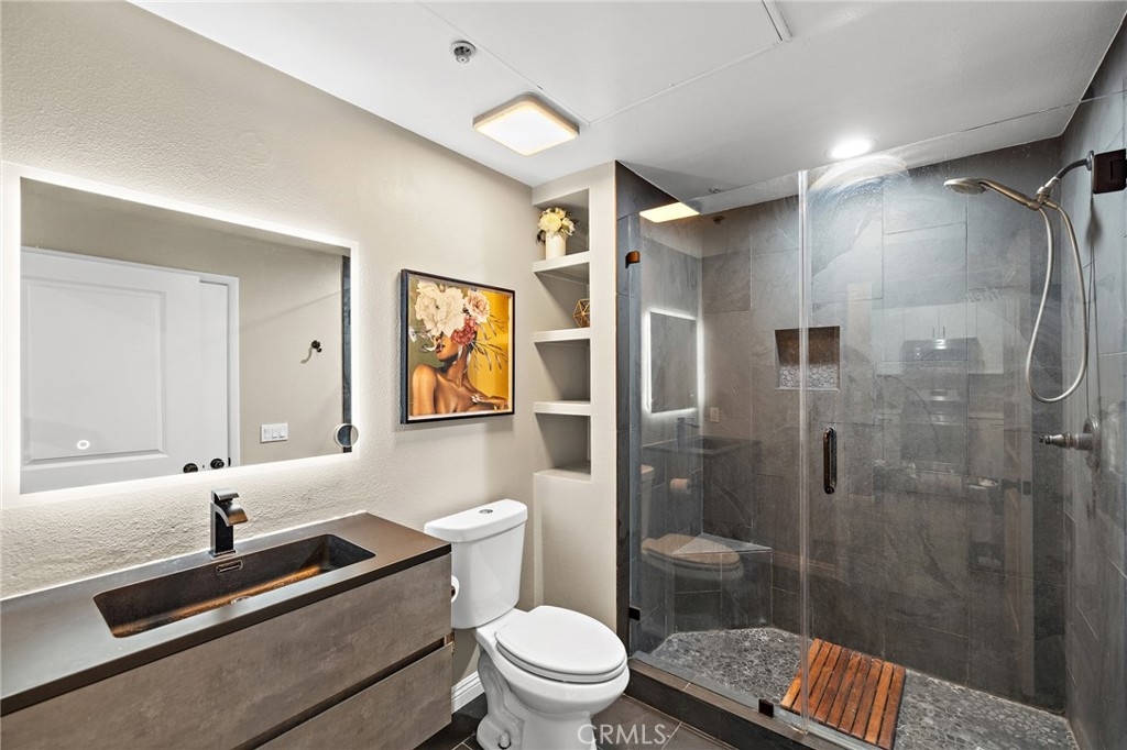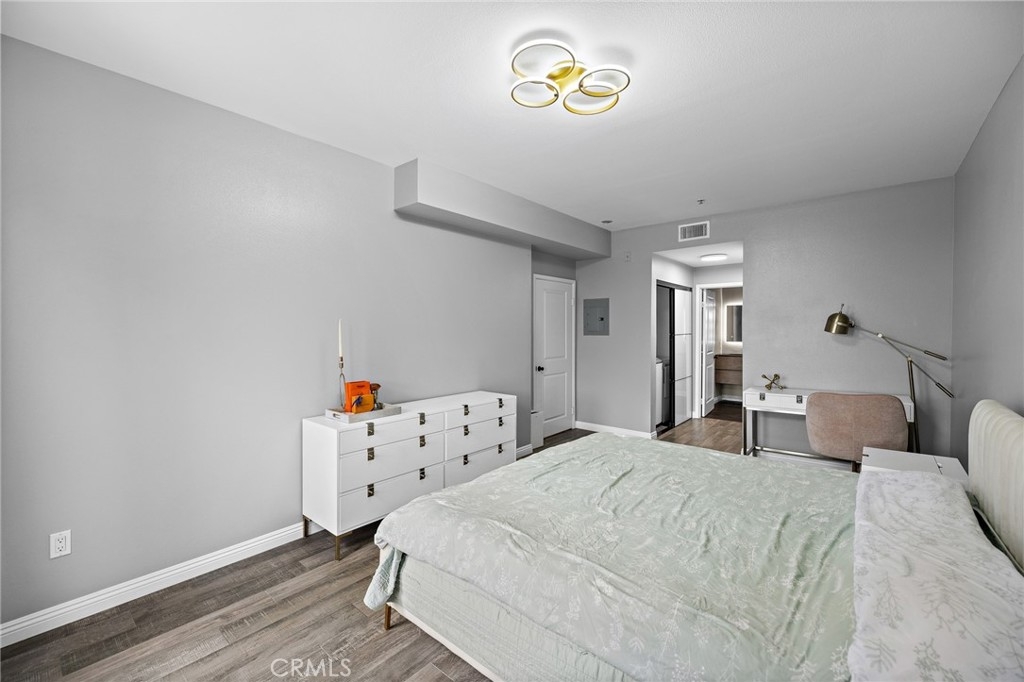 Platinum Triangle Condo! Near OC Vibe! Welcome to this stunning top-floor fully furnished condo at 1801 E Katella #4005 in Anaheim, where elegance meets convenience. Nestled in the highly desired Platinum Triangle neighborhood, this remodeled home has wonderful city views and boasts prime access to parking, an elevator, and storage, making it a true gem in the community. This unit comes with two parking spaces and a storage room. Step inside this delightful 784 square foot home, adorned with exquisite porcelain flooring that flows seamlessly throughout. The living space is bathed in nourishing natural light from large glass French doors that invite you to unwind on your private balcony. Enjoy evenings in your cozy living area, equipped with a large flat-screen TV, offers a perfect spot for relaxation. The modern kitchen features sleek white high-gloss cabinets with stylish brass hardware, a state-of-the-art pull-down brass faucet, and quartz countertops with elegant bar seating illuminated by beautiful LED pendant lights. With newer stainless-steel appliances and a new garbage disposal, every meal can be crafted with ease. Retreat to the spacious primary bedroom, designed for comfort with ample space for a king-sized bed. Revel in the grandeur of a lovely hanging light fixture and a generous walk-in closet that caters to all your storage needs. The updated bathroom features an updated sink with a touch-sensitive lighting mirror, Alexa speaker, a glass walk-in shower adorned with a stone mosaic floor, and Italian slate tiles. This home is complete with an efficiently designed laundry closet, accommodating new full-sized washer and dryer, and new shelving for perfect organization witth new tempered glass doors giving it a classy look. The entire home is freshly painted and impeccably cleaned, this residence is move-in ready! Enjoy the amenities of the Stadium Lofts Community including Water, Trash, Free Wi-Fi, AMPLE GUEST PARKING, Electric Car Charging, clubhouse, a sparkling pool and spa, a fully equipped gym with a Peloton room, a sauna, indoor lounges, and outdoor BBQ areas perfect for entertaining. Enjoy the vibrant local lifestyle, with top attractions like Angel Stadium, The Grove, Disneyland, and the Honda Center all at your doorstep, along with a plethora of dining and shopping options. Convenient freeway access to the 5 and 57 freeways ensures that everything you need is close to home. Do not miss the chance to call this exquisite abode your home!