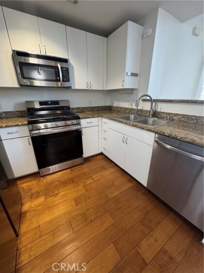 Welcome to this top floor modern 2 bedroom + loft, 2 full bathroom home, with high ceilings, balcony with gorgeous skyline and treetop views, and direct view of fireworks at Angels Stadium. One of largest homes in Stadium Lofts, 1303 sq ft. Open concept kitchen has new Samsung stainless stove, dishwasher and refrigerator. Both bathrooms are spacious and updated. Primary bedroom suite has walk-in closet with built-in cabinetry. Upstairs, the versatile loft offers flexibility for an office, 3rd bedroom, or a creative retreat. Beautiful wood floors, washer/dryer closet , lots of natural light, freshly painted. 3 CAR Parking Space in community garage, and ample guest parking. Many amenities- pool, spa, full fitness center, sauna and recreation room. located in desirable Platinum Triangle area, close to The Grove, Angel Stadium, and top restaurants, and a short drive or public transit ride to Anaheim GardenWalk, Honda Center, Anaheim Packing District, Disneyland, and Downtown Disney.