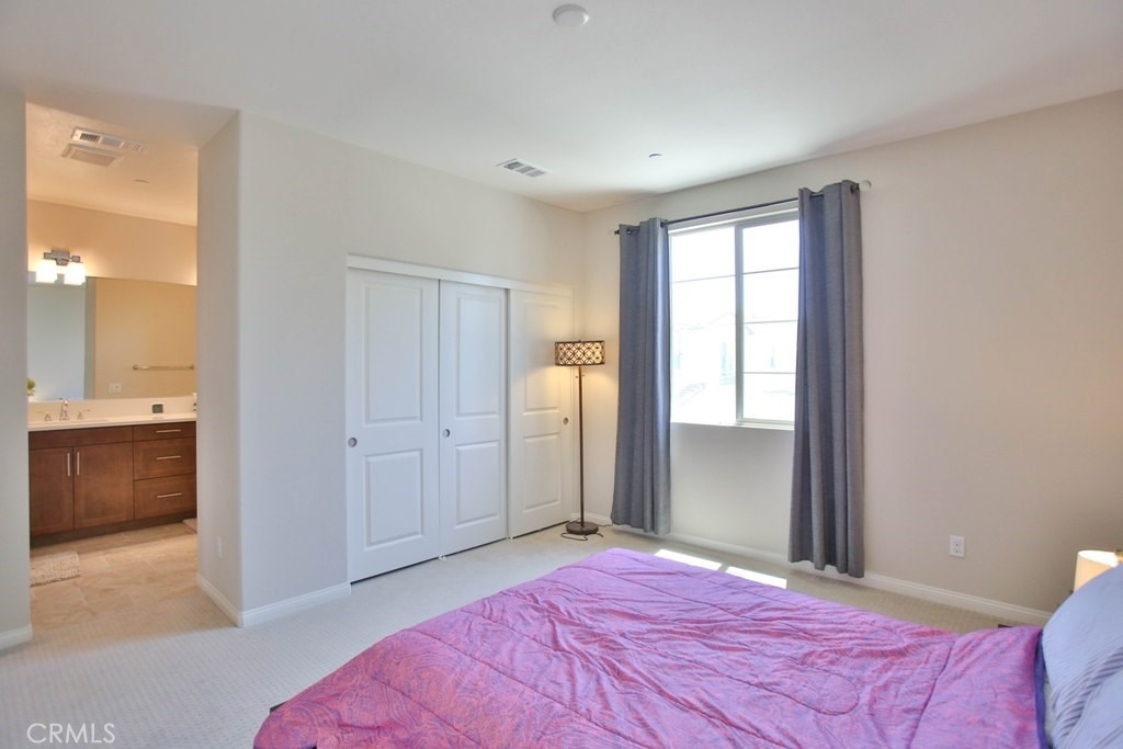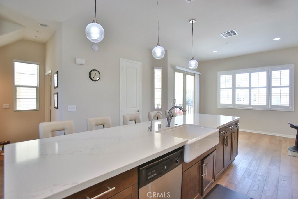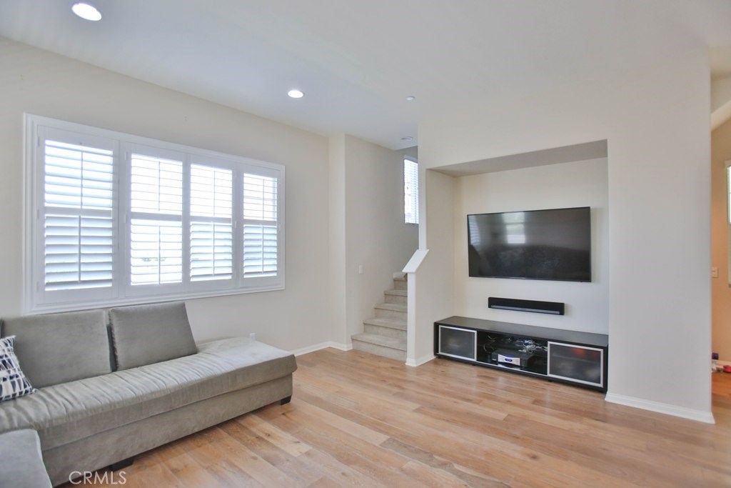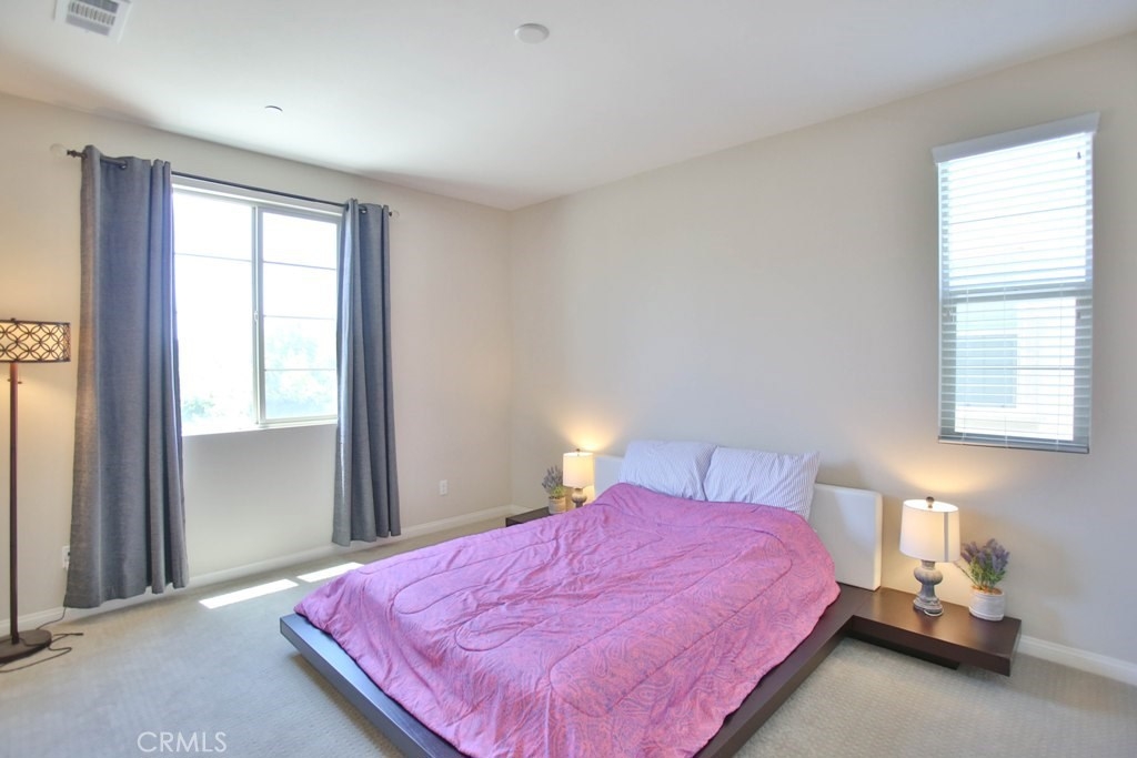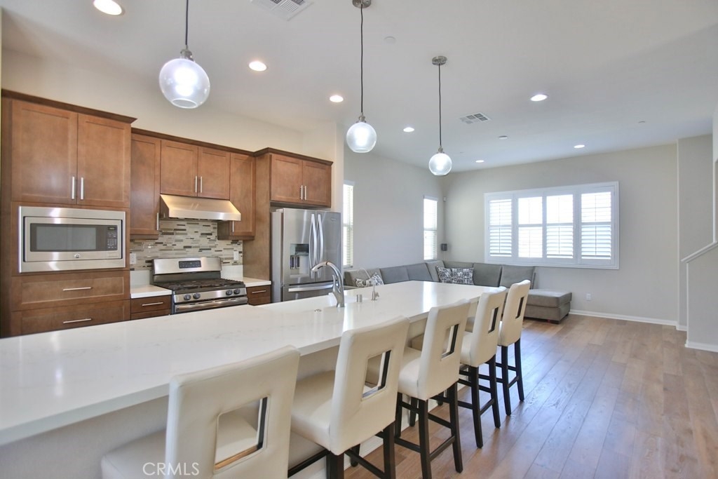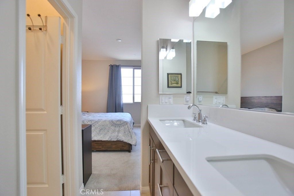 This beautiful, newly built detached home is fully equipped with many upgrades: large entertaining island with quartz countertops, stainless steel appliances, window shutters, hardwood floors, premium carpet in all the bedrooms, water softener system, filtered water system and is wired for an alarm system. As you walk into this luxury modern home, you will see a private front yard with a beautiful garden. The first level entry way has the guest bedroom with an adjacent full bathroom and quick access to a spacious 2-car garage. Take the stairway to the second level you'll find an open concept living and entertainment area with a 10 foot high ceiling, dining area and kitchen. The kitchen offers a huge island with quartz countertops, pantry and plenty of cabinet storage, 1/2 bathroom/powder room, and a private balcony just off the dining area. Take a second stairway to the top floor you'll find two spacious private master suites with dual vanities and a full bathroom. In the hallway between the two master suites, you'll find extra storage cabinets and a closet with stackable washer and dryer units. You will adore every piece of this home. The community is also well maintained with plenty of guest parking, low HOA dues and no Mello Roos. Restaurants and shopping areas are within walking distance and access to the 5 and 91 freeway are just minutes away.