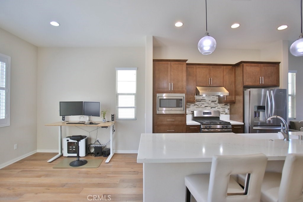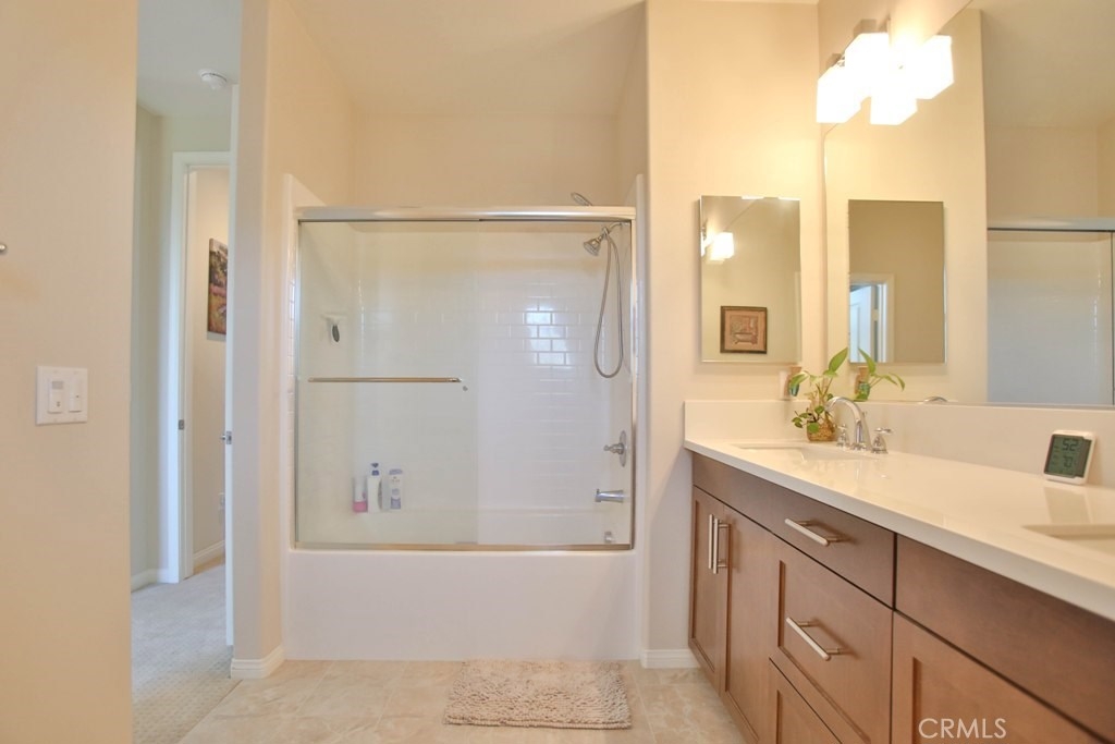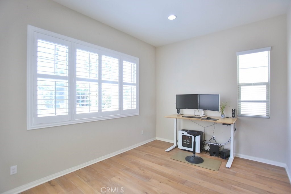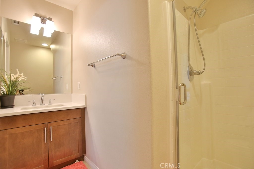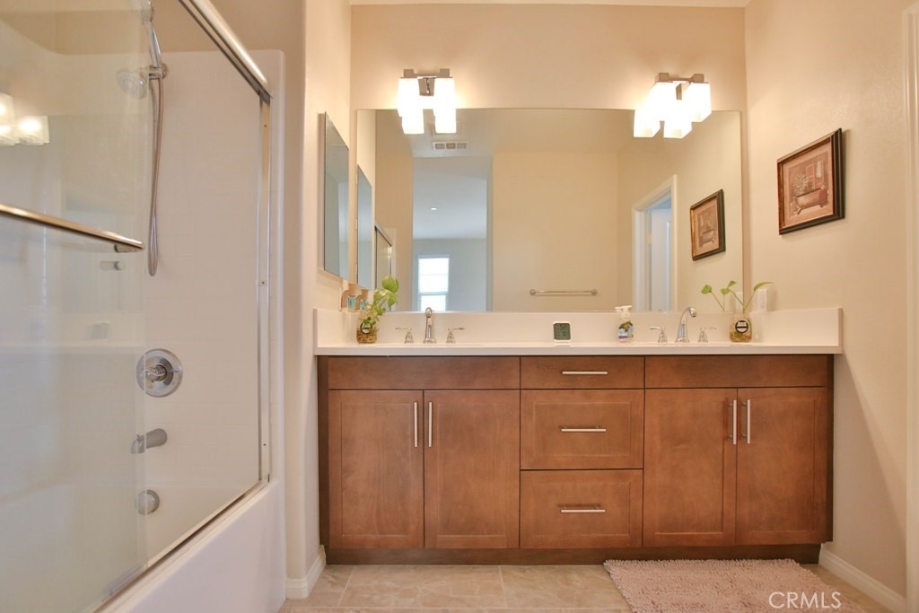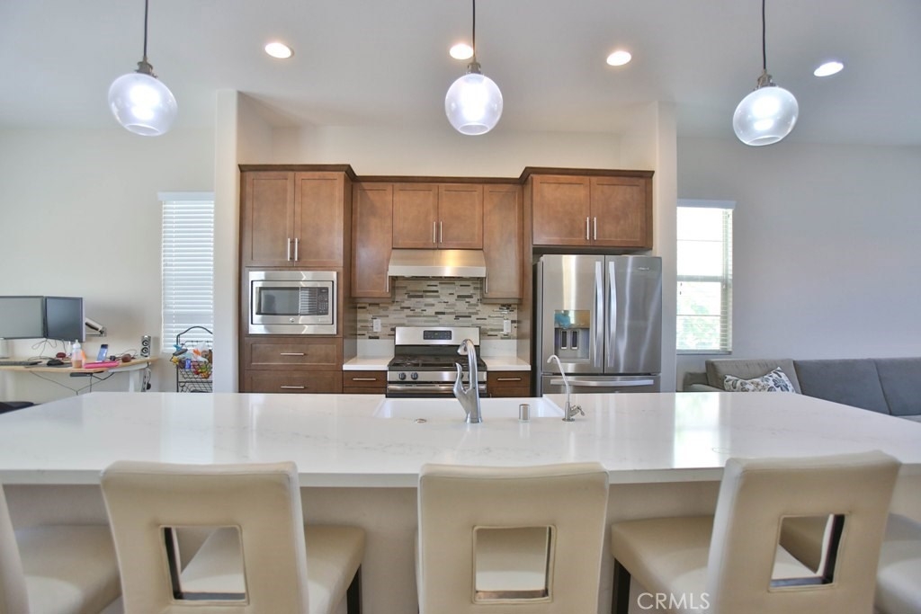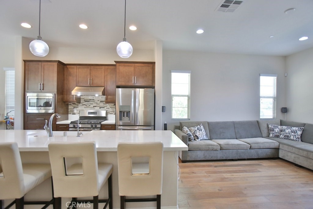 This beautiful, newly built detached home is fully equipped with many upgrades: large entertaining island with quartz countertops, stainless steel appliances, window shutters, hardwood floors, premium carpet in all the bedrooms, water softener system, filtered water system and is wired for an alarm system. As you walk into this luxury modern home, you will see a private front yard with a beautiful garden. The first level entry way has the guest bedroom with an adjacent full bathroom and quick access to a spacious 2-car garage. Take the stairway to the second level you'll find an open concept living and entertainment area with a 10 foot high ceiling, dining area and kitchen. The kitchen offers a huge island with quartz countertops, pantry and plenty of cabinet storage, 1/2 bathroom/powder room, and a private balcony just off the dining area. Take a second stairway to the top floor you'll find two spacious private master suites with dual vanities and a full bathroom. In the hallway between the two master suites, you'll find extra storage cabinets and a closet with stackable washer and dryer units. You will adore every piece of this home. The community is also well maintained with plenty of guest parking, low HOA dues and no Mello Roos. Restaurants and shopping areas are within walking distance and access to the 5 and 91 freeway are just minutes away.
