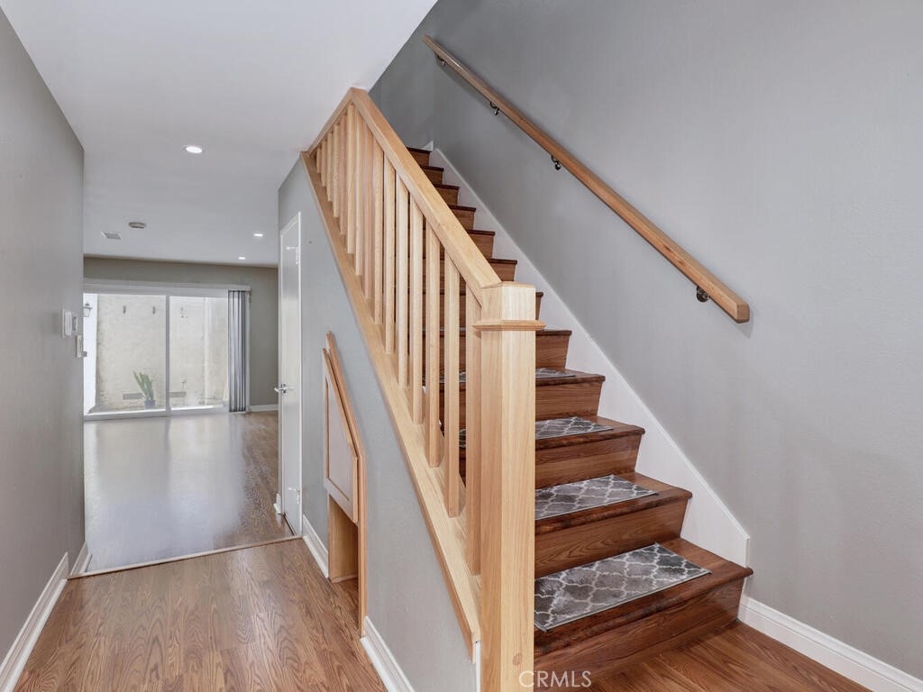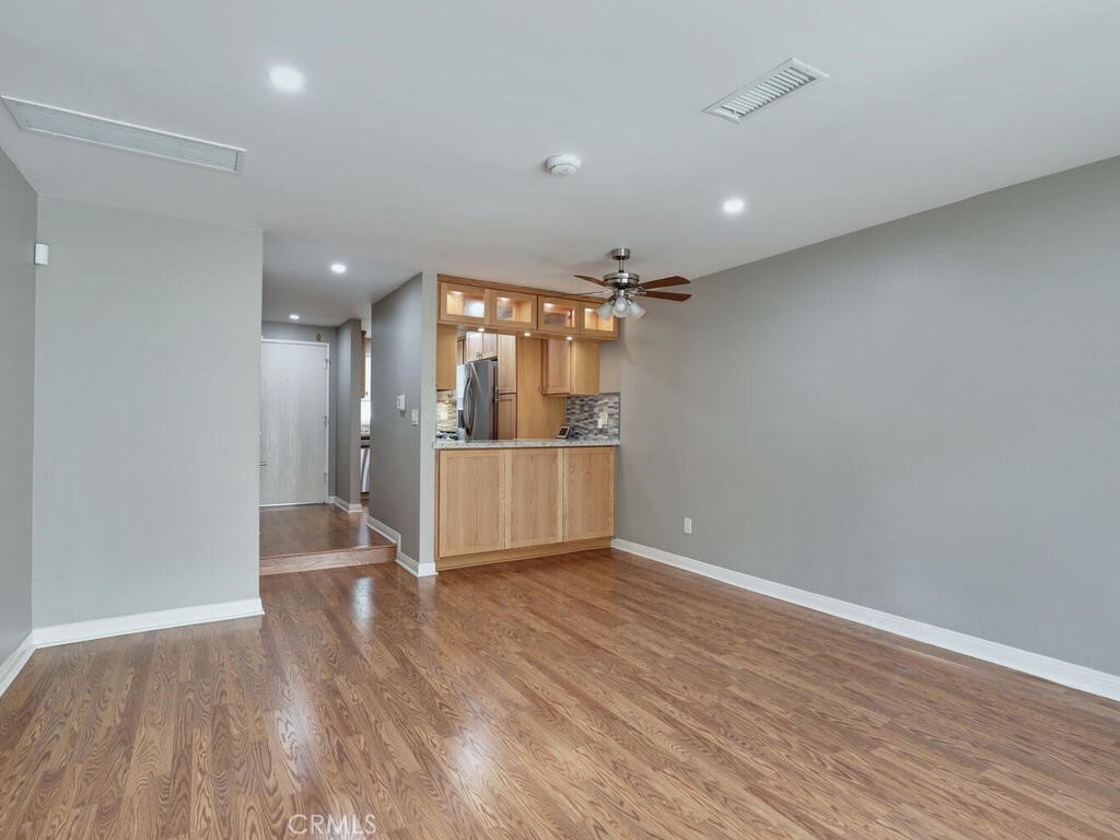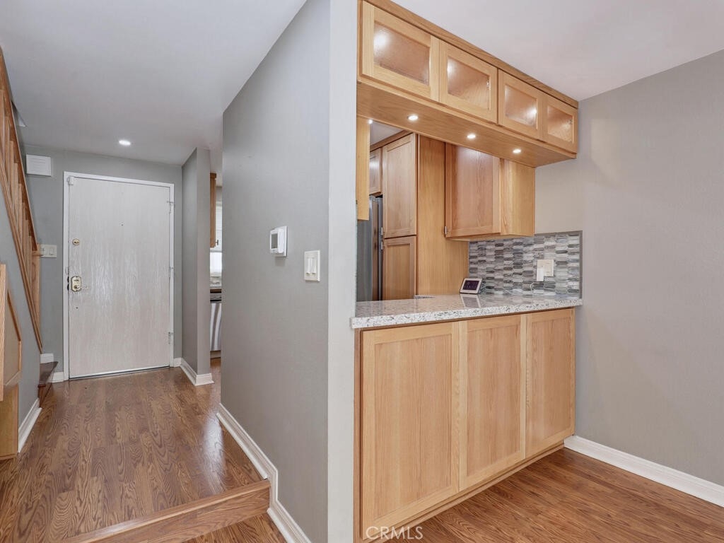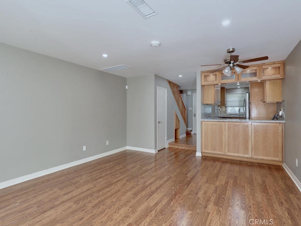 This is an awesome 2 story end unit townhome in the most excellent location in the complex! Completely renovated and ready for immediate move in. Tucked in the back corner, very private and easy to get to. New laminate flooring throughout, newer custom 2 tone paint throughout, smooth ceilings, AC/FA are upgraded. Kitchen has been completely remodeled! It's beautiful and completely custom, every inch of this space was used with efficiency in mind. Quartz Countertops, Brushed nickel hardware, stainless appliances including the counter depth fridge all stay. Gray stone mosaic backsplash and farmers sink complete with brushed nickel faucet. Dining/Living combo area is generous in size and can accommodate a sectional sofa and dining area. Slider exits to a cozy patio, complete with electric Sunsetter shade for those warm summer days. There are 2 One car garages, both with garage door openers. 1/2 bath is tucked away under the stairway. Stair railings were replaced with new wood. Primary bedroom is good size with a large wardrobe dressing area and vanity. Upstairs bath is gorgeous and new! Everything is sparkling. Walk in shower is large, all new fixtures, custom tile, vanity, countertops and surround are new and there is a vanity and separate sink in the dressing area. Close to shopping and freeways. low association dues as well