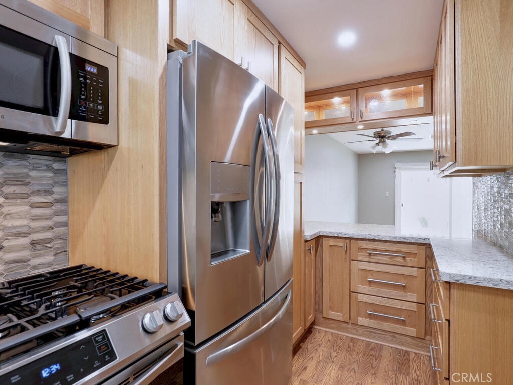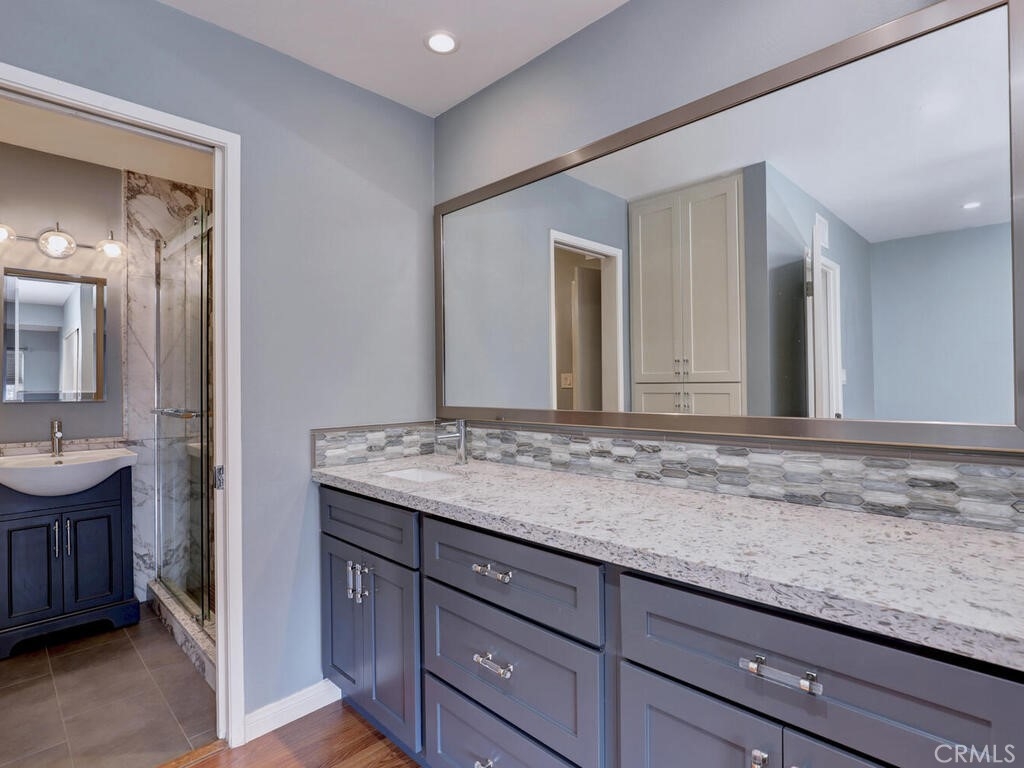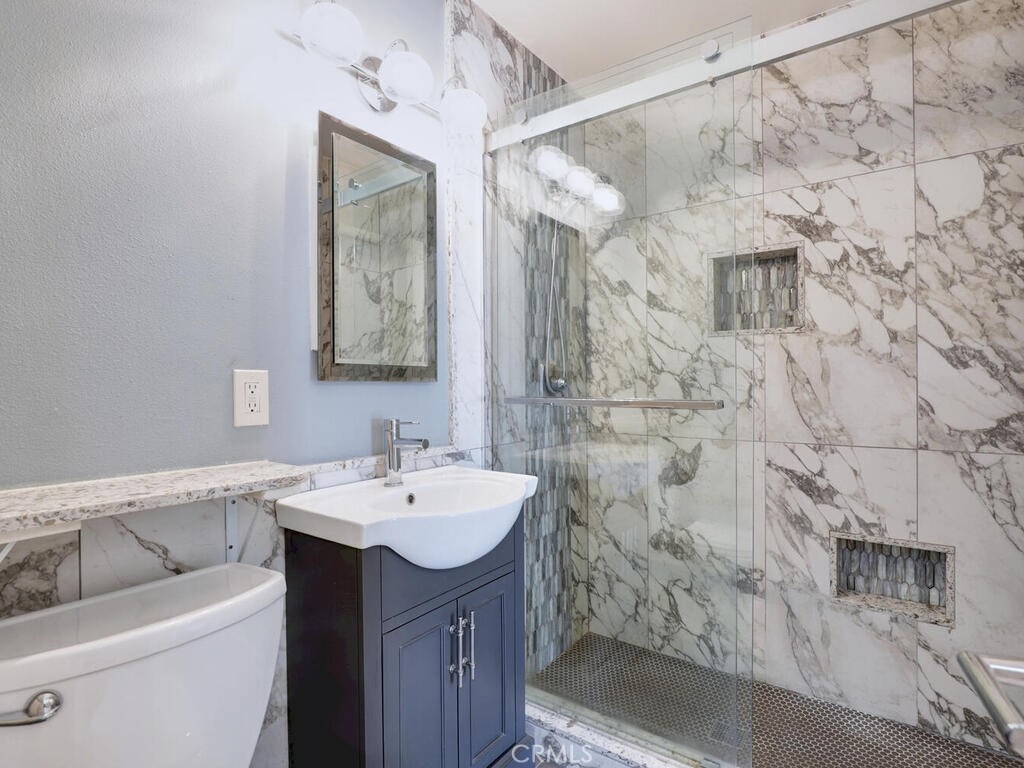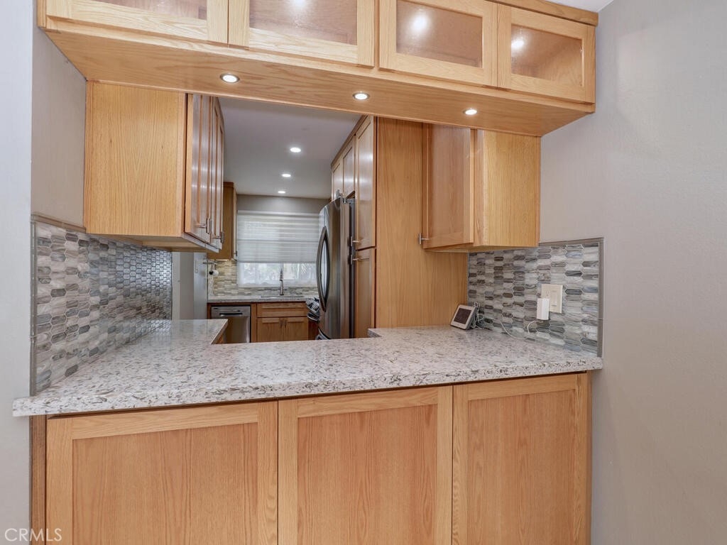 This is an awesome 2 story end unit townhome in the most excellent location in the complex! Completely renovated and ready for immediate move in. Tucked in the back corner, very private and easy to get to. New laminate flooring throughout, newer custom 2 tone paint throughout, smooth ceilings, AC/FA are upgraded. Kitchen has been completely remodeled! It's beautiful and completely custom, every inch of this space was used with efficiency in mind. Quartz Countertops, Brushed nickel hardware, stainless appliances including the counter depth fridge all stay. Gray stone mosaic backsplash and farmers sink complete with brushed nickel faucet. Dining/Living combo area is generous in size and can accommodate a sectional sofa and dining area. Slider exits to a cozy patio, complete with electric Sunsetter shade for those warm summer days. There are 2 One car garages, both with garage door openers. 1/2 bath is tucked away under the stairway. Stair railings were replaced with new wood. Primary bedroom is good size with a large wardrobe dressing area and vanity. Upstairs bath is gorgeous and new! Everything is sparkling. Walk in shower is large, all new fixtures, custom tile, vanity, countertops and surround are new and there is a vanity and separate sink in the dressing area. Close to shopping and freeways. low association dues as well