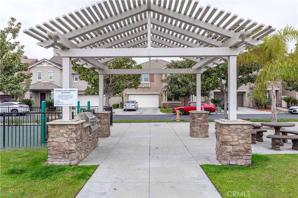 This 3 Bedroom, 2.5 Bathroom end unit in the Magnolia Lane HOA offers convenient access and a well-designed open floor plan. The main level features 9-foot ceilings, shutters, and tile flooring throughout. The custom kitchen boasts an island, granite countertops, and abundant cabinet storage, with a range, microwave, and dishwasher included. The living room features a gas fireplace. A half bath is also conveniently located on the main floor. All the bedrooms are upstairs, including primary suite with a private bathroom featuring tile flooring, granite countertops, a dual vanity, a separate soaking tub, and an enclosed shower. The home also includes a laundry room with washer/dryer hookups inside for added convenience. Additional features include an open front patio, a 2-car garage with elevated storage racks, and close proximity to the playground/tot lot. The property is ideally situated near the 5 and 91 freeways, providing close access to commuting and nearby amenities.