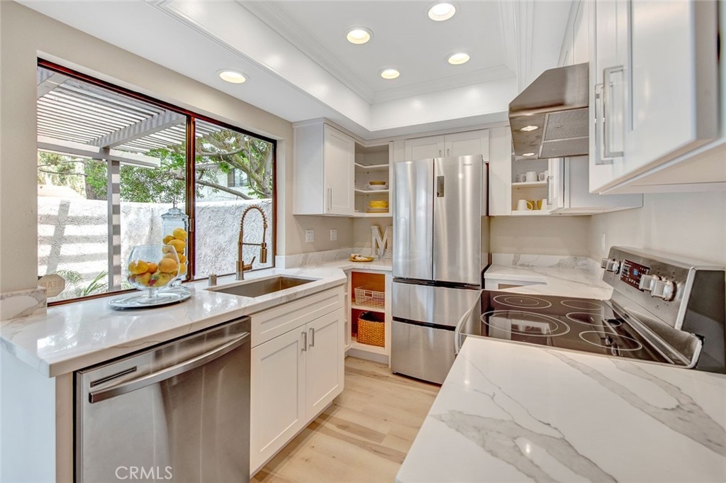 Top to bottom remodel just completed at this spacious townhome-style Villa Frontera PUD! End unit location offers restorative greenbelt views with mature trees and breathing room. Fully remodeled kitchen features self-closing white cabinetry, quartz countertops, stainless appliances and farm sink. Smooth ceilings, recessed lighting and new overhead light fixtures, newly painted interior, laminate wood & luxury vinyl flooring and new carpet. Both baths (1 full, 1 half) are fully remodeled with white cabinetry, marble countertops, new tub with tile & marble skirt and shower surround--gorgeous! New 2" blinds are ready to install. Spacious living room with vaulted ceiling and high windows. Separate family room with dining area offers views of the fully enclosed covered patio with access to the adjacent greenbelt. Attached 2 car garage with direct entry and laundry area (washer/dryer included) and storage. Oversize primary bedroom has double width closets; storage closets on both levels of the home, as well as a linen closet. HOA maintains the exterior of the unit (roof replacement is underway in the community), gardening and common recreation areas. There is direct access to Anaheim Coves walking and bike trail and the Santa Ana Bike Trail is nearby. Convenient to transportation and shopping. This home is move-in ready!