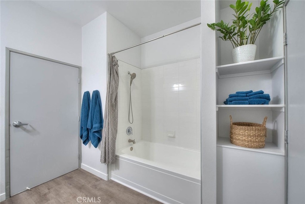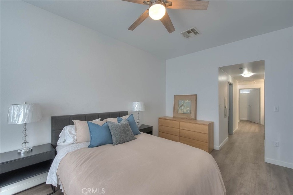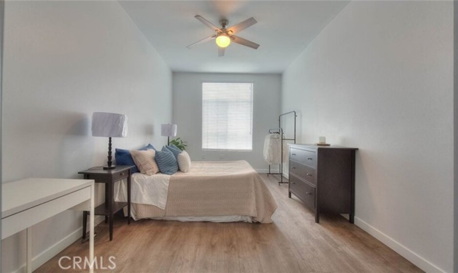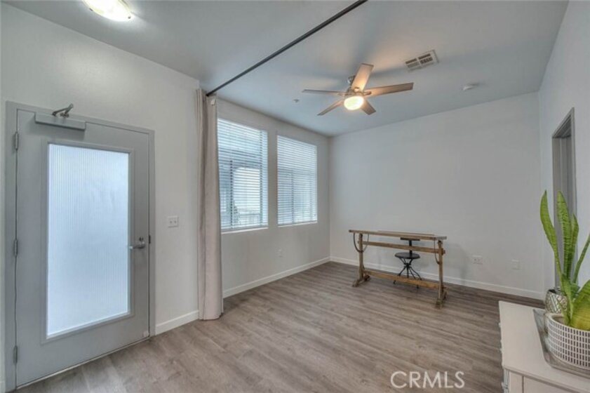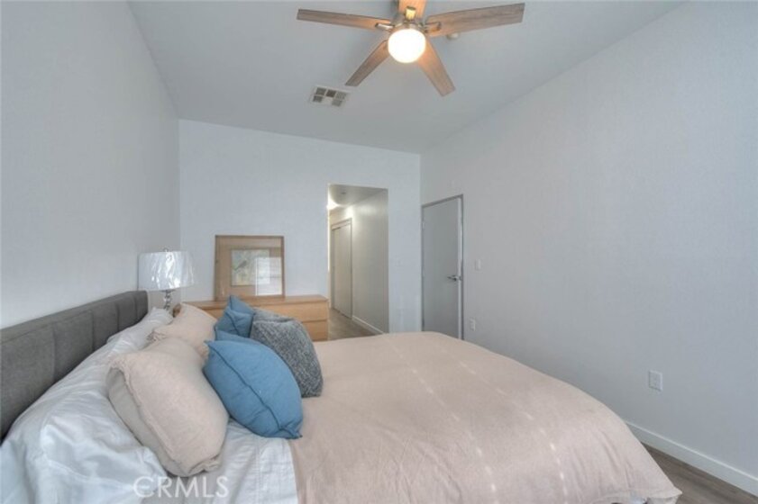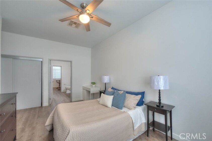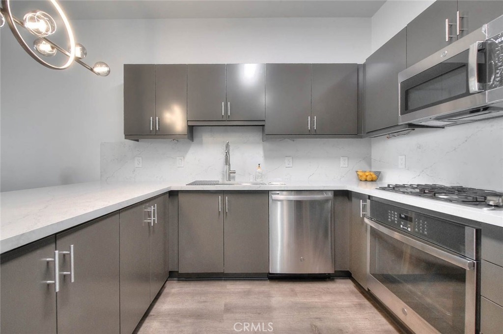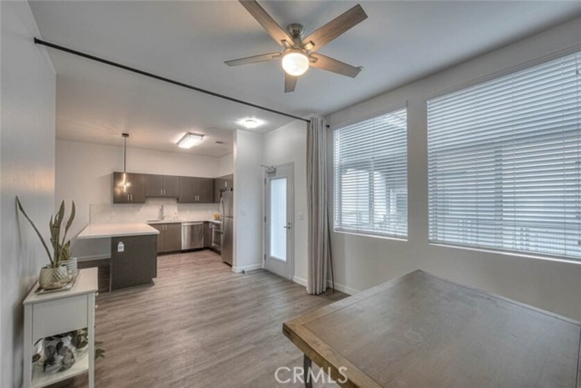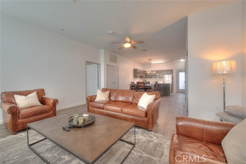 This modern remodeled property offers a stylish 3-bedroom, 2-full-bathroom condominium located mere minutes from Disneyland. Key features include high ceilings and striking neutral flooring throughout, a beautiful kitchen boasting ample cabinetry, stainless steel appliances, quartz countertops, and a huge breakfast bar area. The open-concept kitchen, dining area, and living room provide an ideal floor plan for both entertainment and relaxation. The expansive master bedroom features an en-suite full bathroom and a spacious walk-in closet, complemented by an additional closet. The second bedroom is roomy and includes its own full bathroom. The third bedroom currently serves as a functional workspace, offering the potential for a home office. Residents of the complex enjoy access to a picturesque courtyard area complete with a pool, jacuzzi, BBQ facilities, and seating areas. Tastefully renovated, this property is move-in ready. Experience the best of urban living in downtown Anaheim, steps from an array of amenities including restaurants, bars, breweries, bakeries, coffee shops, and boutiques, with the lively Packing district less than a mile away.